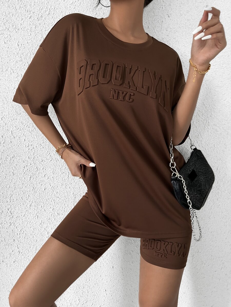 Letter Textured Drop Shoulder Tee & Cycling Shorts
