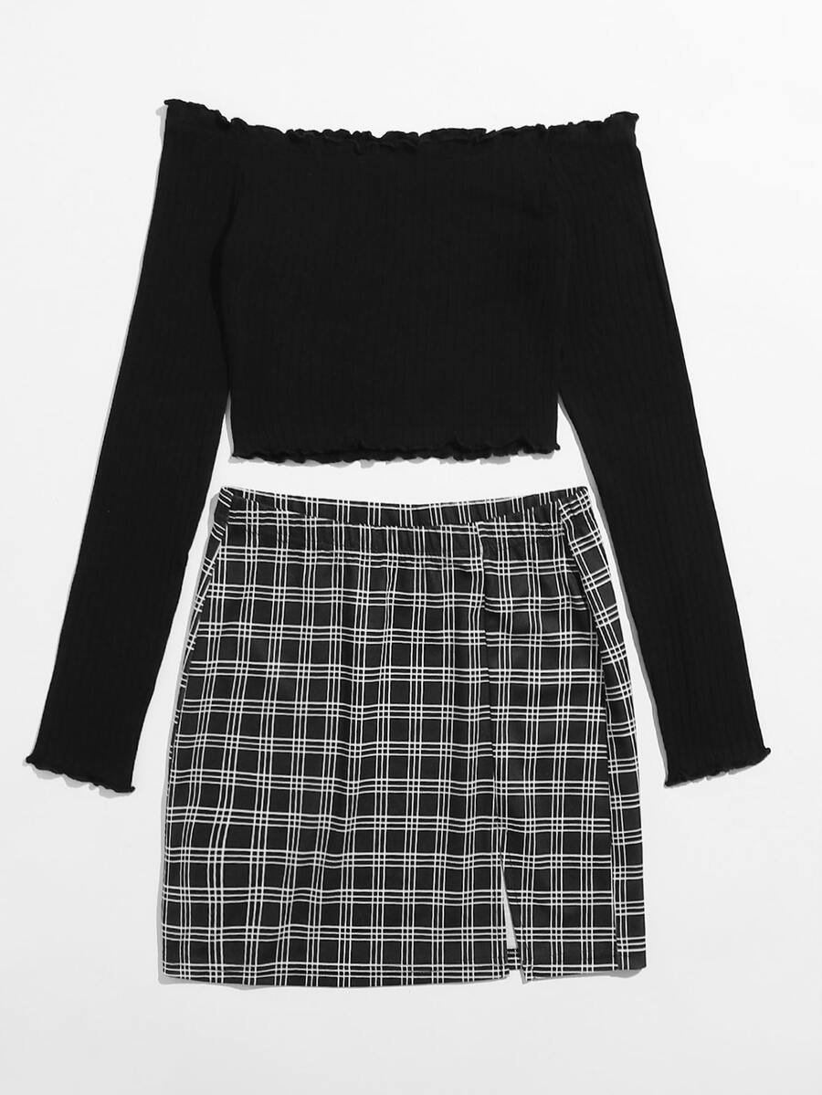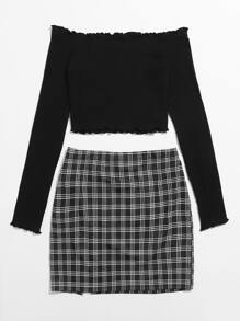 Lettuce-Edge Crop Top & Plaid Mini Skirt Set