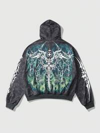Men's Street Style Gothic Casual Zip Up Hooded Graphic Print Sweatshirt, Fall, Long Sleeve Top
