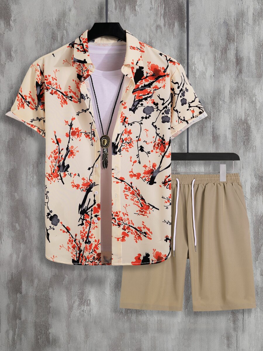 Men Floral Print Shirt & Drawstring Waist Shorts Without Tee