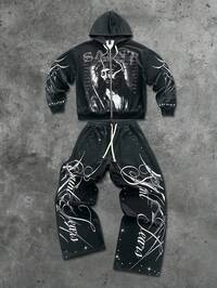 Goth 2pcs Men Letter & Figure Print Hoodie Sweatshirt And Drawstring Sweatpants Tracksuit
