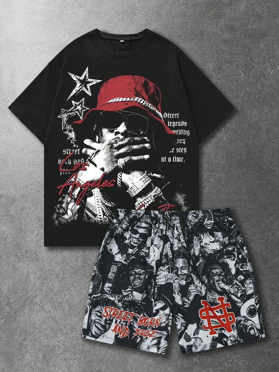 Men's Slogan & Figure Print Round Neck Short Sleeve T-Shirt And Shorts Casual Set
