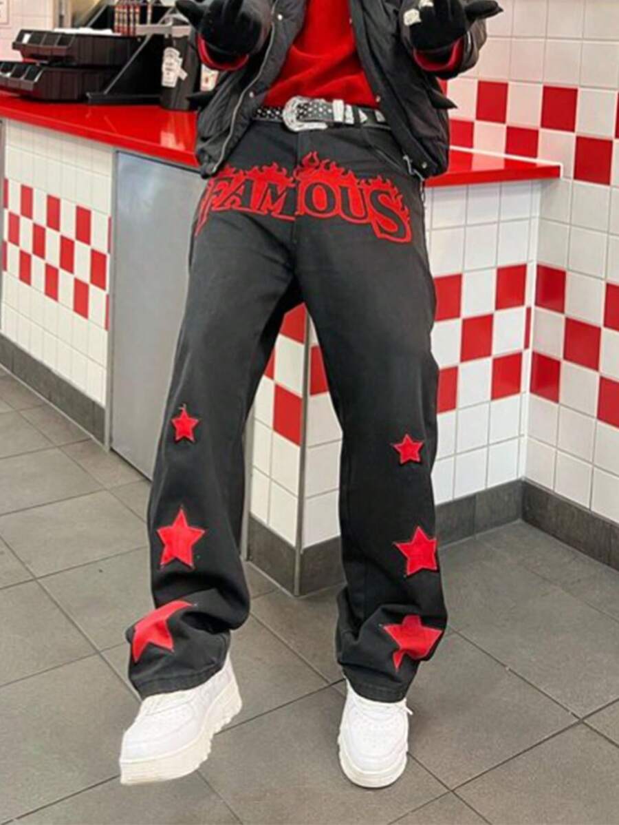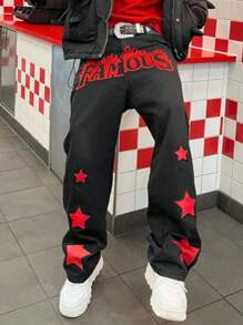 Men's Y2K Star & Letter Printed Wide Leg Jeans With Pockets, Casual Fashion, School