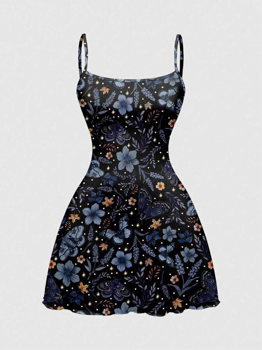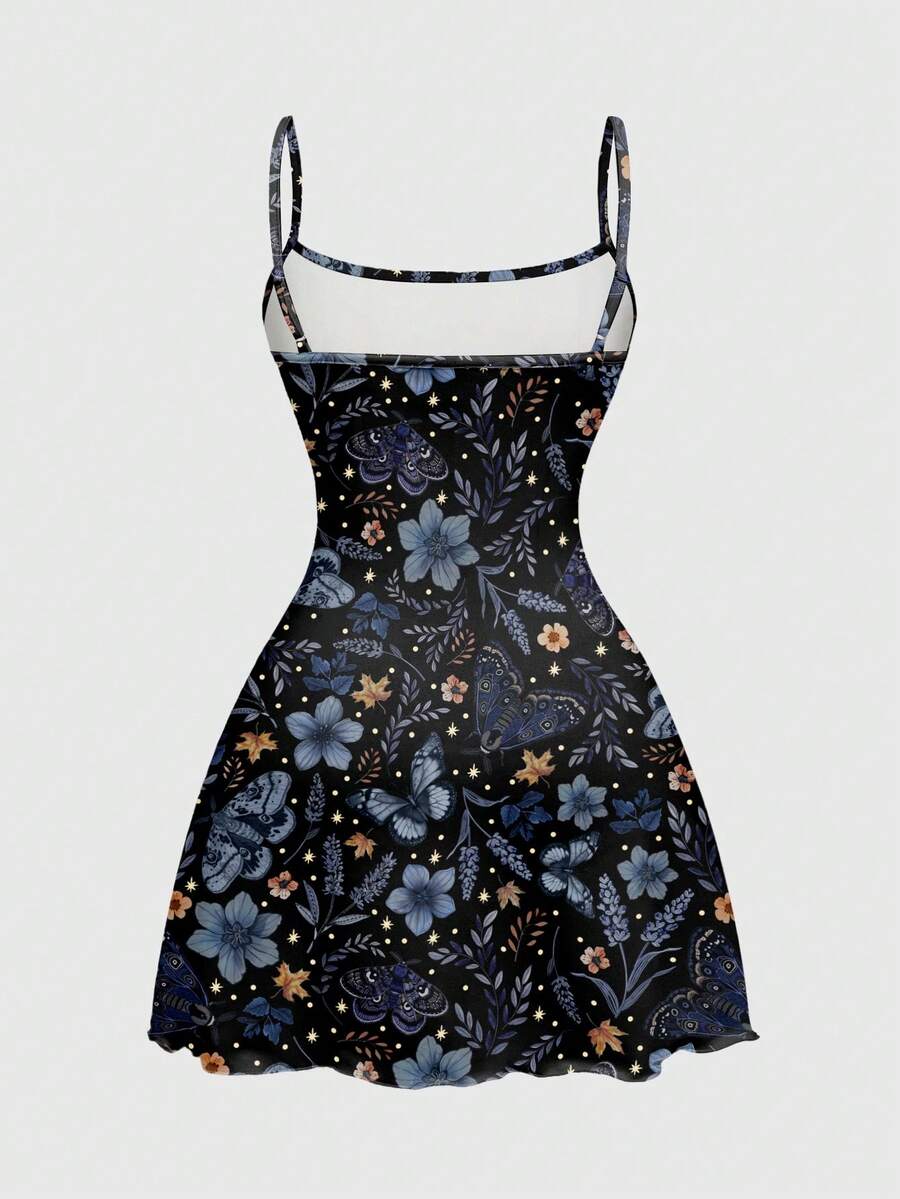 Fairycore Spring/Summer Vacation Flower Black Mysterious Dark Forest Butterfly & Celestial Print Mini Dress For Women, Blue & Purple