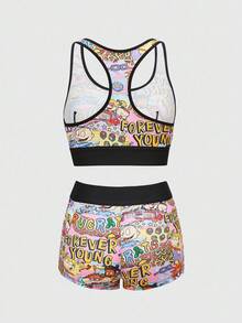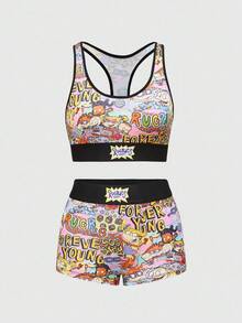 Nick 90's X ROMWE Cartoon Figure Graphic Round Neck Bra & Boxer Briefs Underwear Set