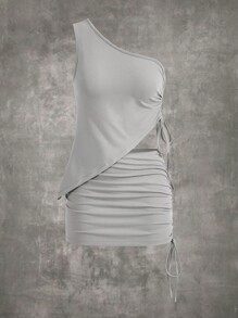 One Shoulder Drawstring Side Asymmetrical Hem Top & Bodycon Skirt