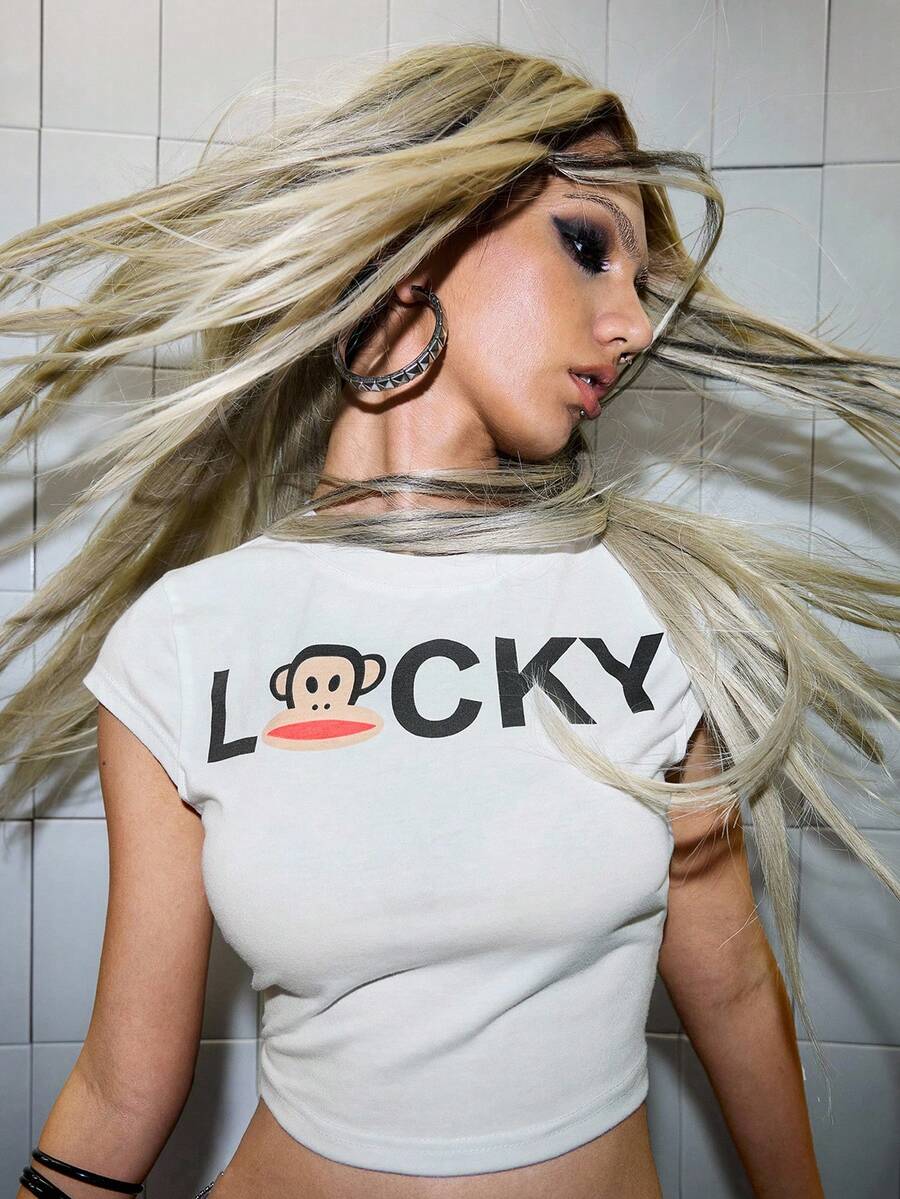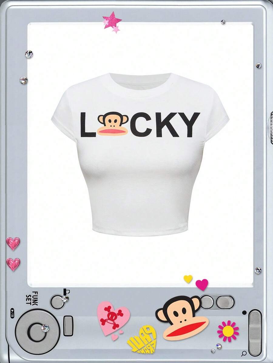 Paul Frank X ROMWE Women's Kpop Casual Letter & Monkey Print Cropped Fitted T-Shirt, Summer
