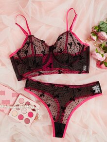 Plus Bow & Polka Dot Print Mesh Underwire Lingerie Set
