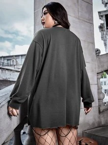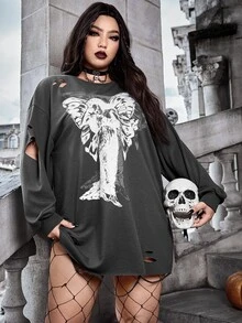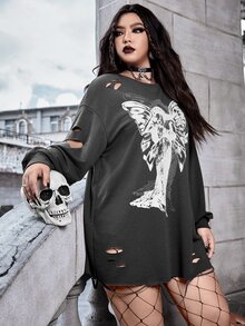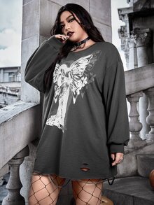 Plus Butterfly & Graphic Print Ripped Drop Shoulder Sweatshirt Dress