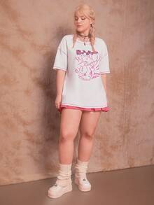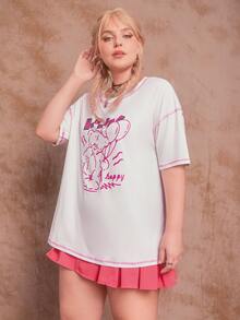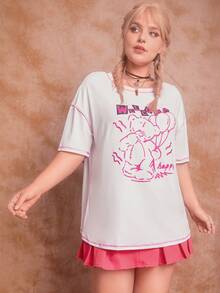 Plus Cartoon & Letter Graphic Top-stitching Drop Shoulder Tee