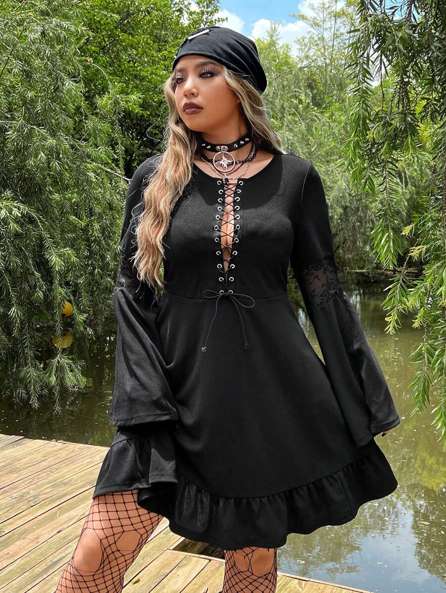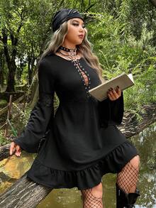 Plus Grommet Lace Up Front Flounce Sleeve Ruffle Hem Dress