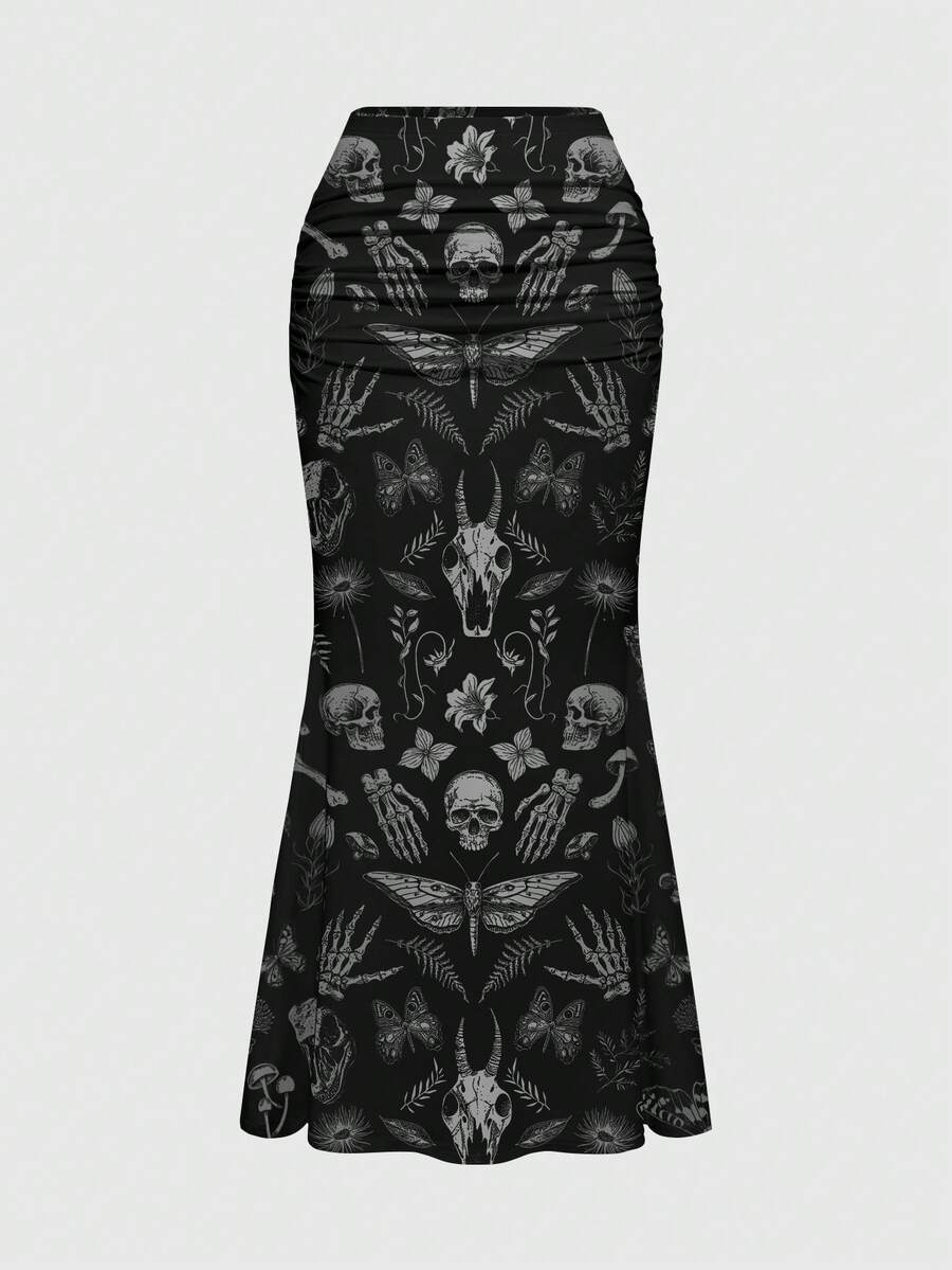 Spring/SummergraphicblackPlus Size Gothic Butterfly, Moth, Plant, Skull, Demon Print Elegant Romantic Vacation Skirt