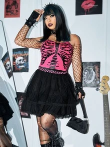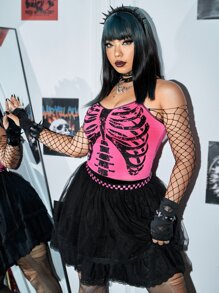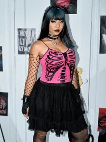 Plus Skeleton Print Cami Top & Mesh Skirt Without Belt