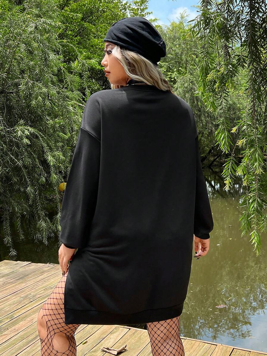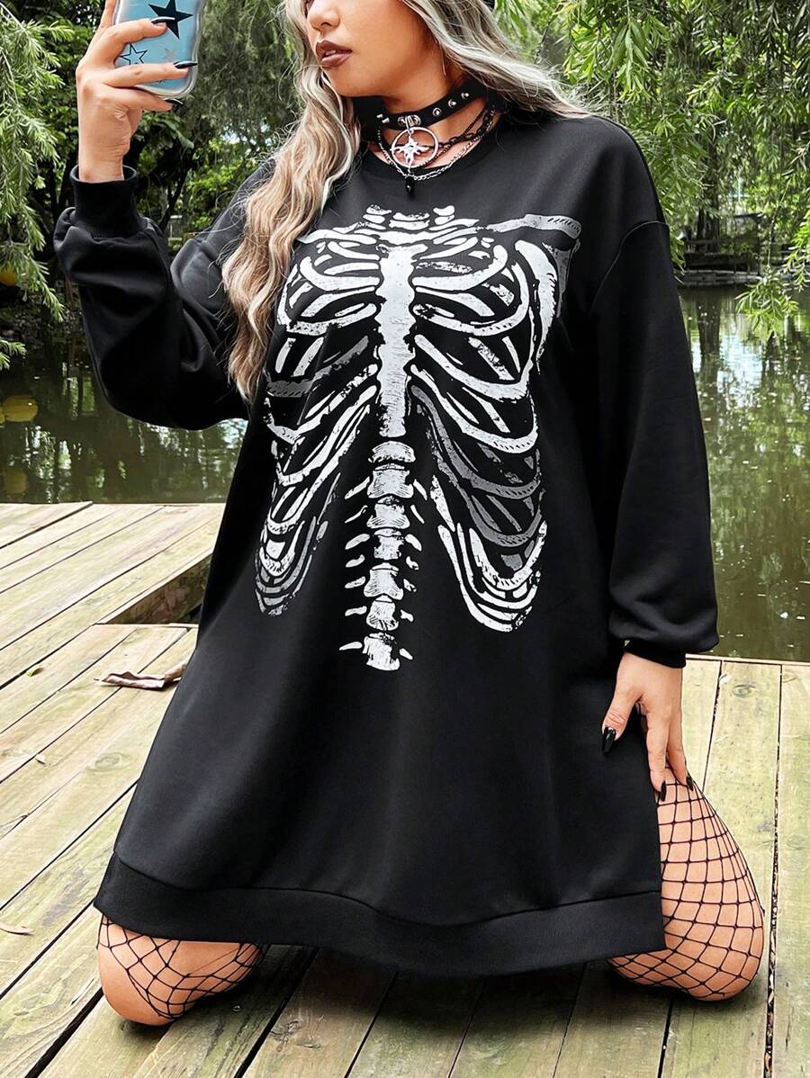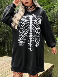 Plus Skeleton Print Drop Shoulder Split Hem Sweatshirt Dress