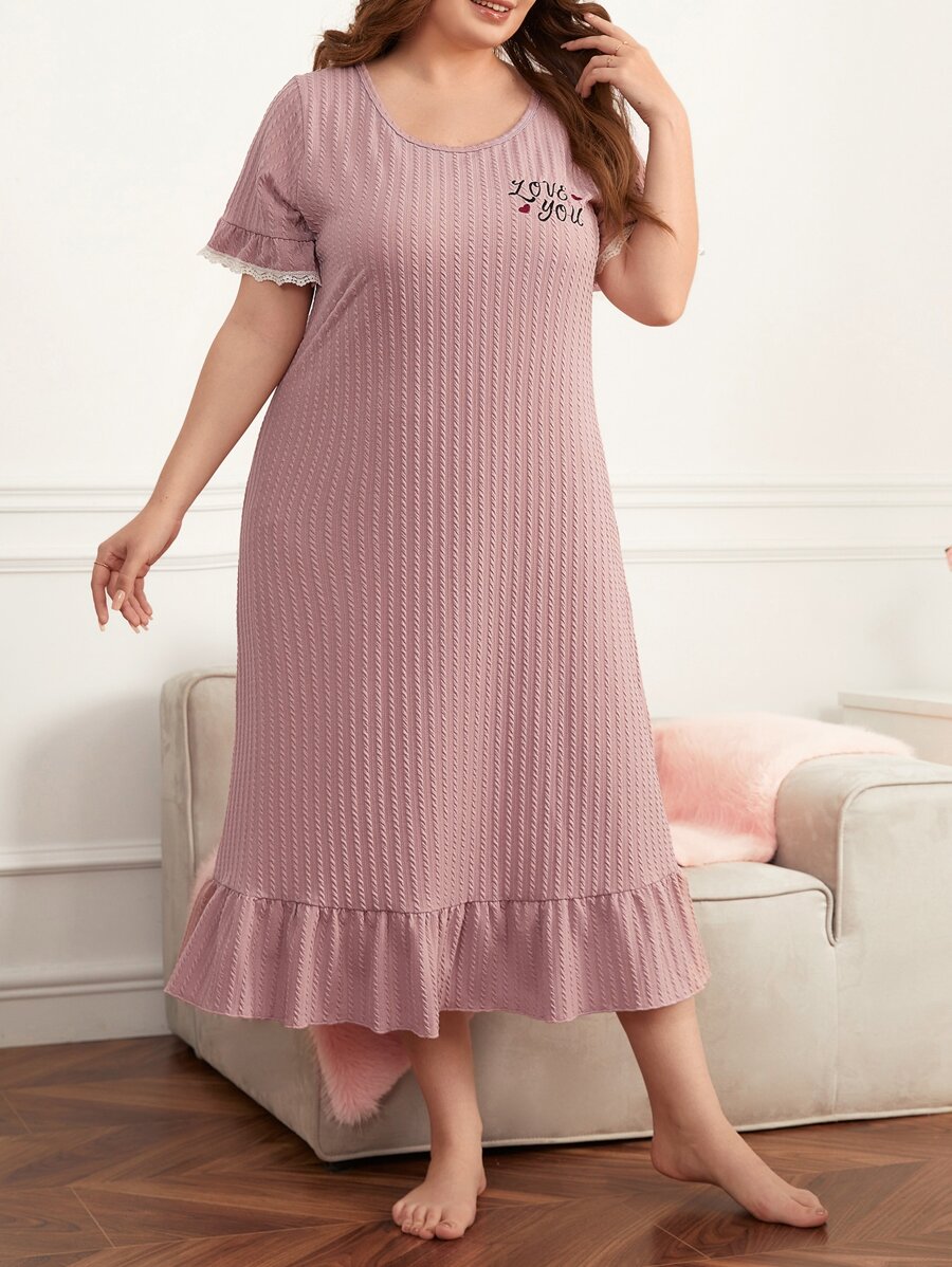 Plus Slogan Graphic Ruffle Hem Waffle Knit Sleep Dress Pajama Dress, Long Dress