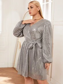 Plus Surplice Neck Lantern Sleeve Belted Sequin Dress