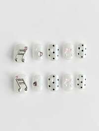 Kawaii 10pcs Cute & Sweet Polka Dot & Bow Element Hand-Painted High-Quality Fake Nails + 3 Sheets Double-Sided Adhesive, Removable & Reusable Glitter Musical Note Mismatch Nail Sticker, Suitable For Holidays, Parties, Dance, And Daily Wear