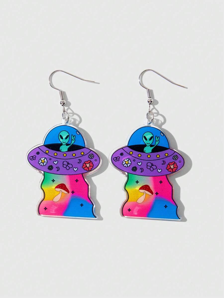 ROMWE Avant 1pair Creative Funny Punk Style Cartoon Ufo Printed Earrings