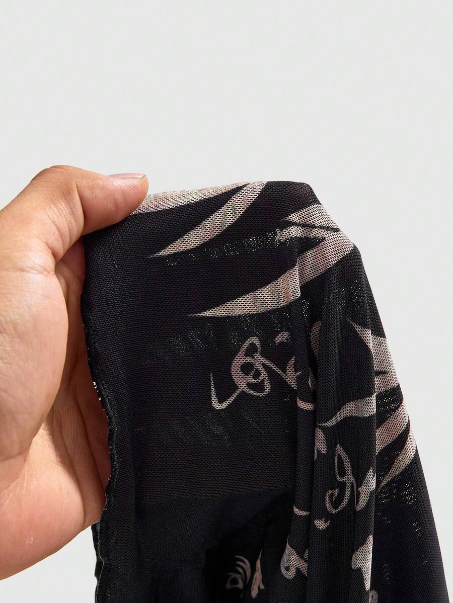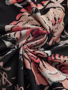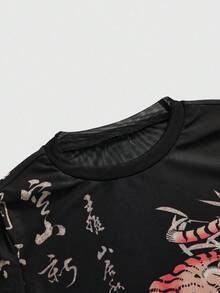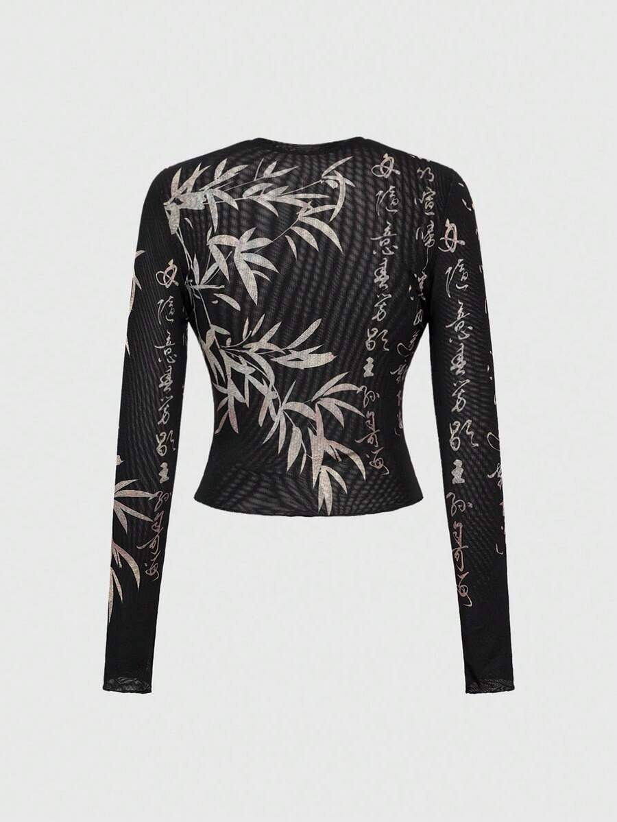 ROMWE Avant Chinese Style Tiger & Bamboo Leaf Calligraphy Print Sheer Blouse