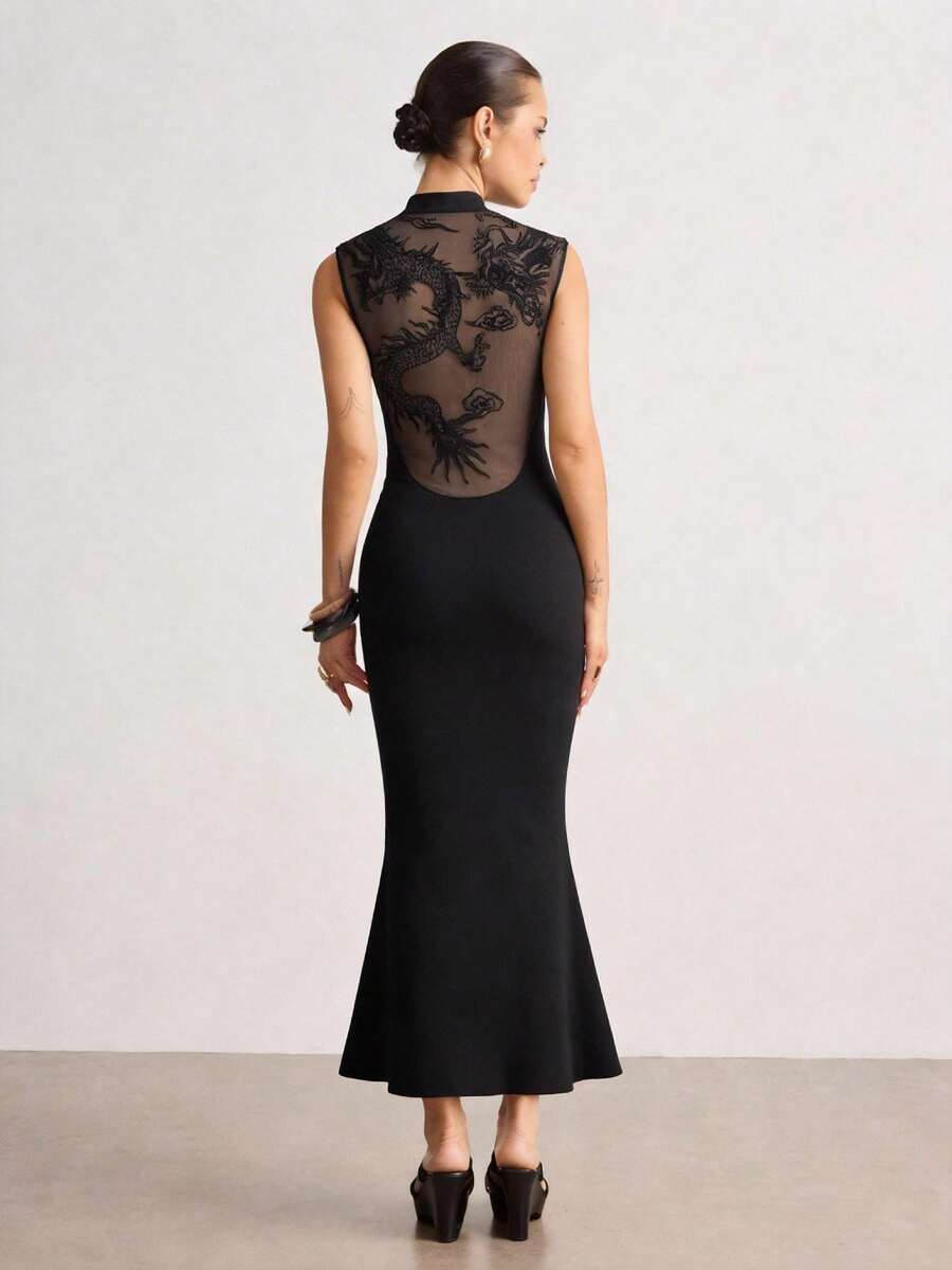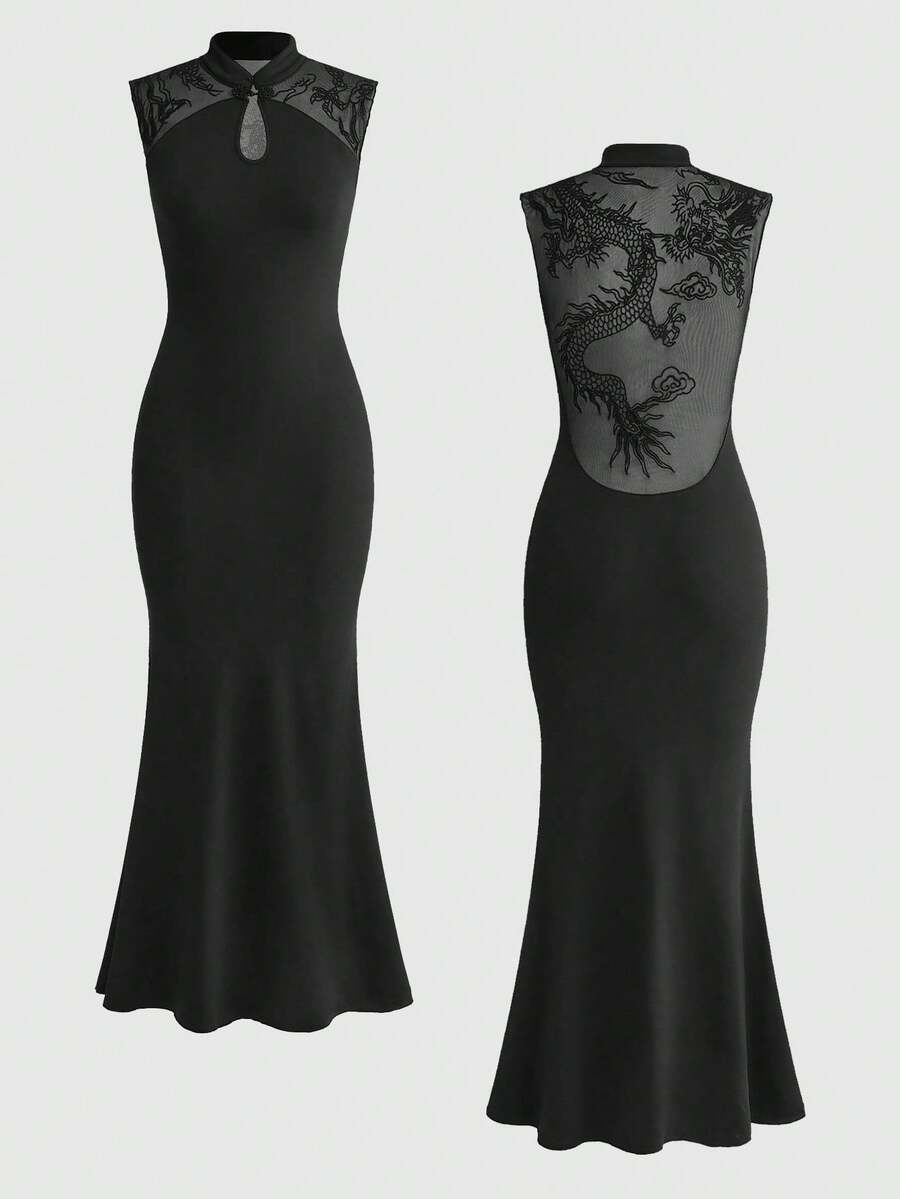 ROMWE Avant Dark Chinese Style Dragon Embroidery Backless Dress For Women