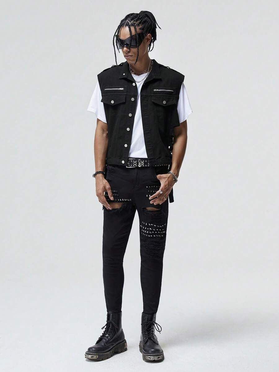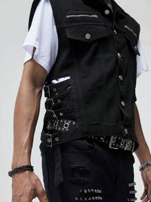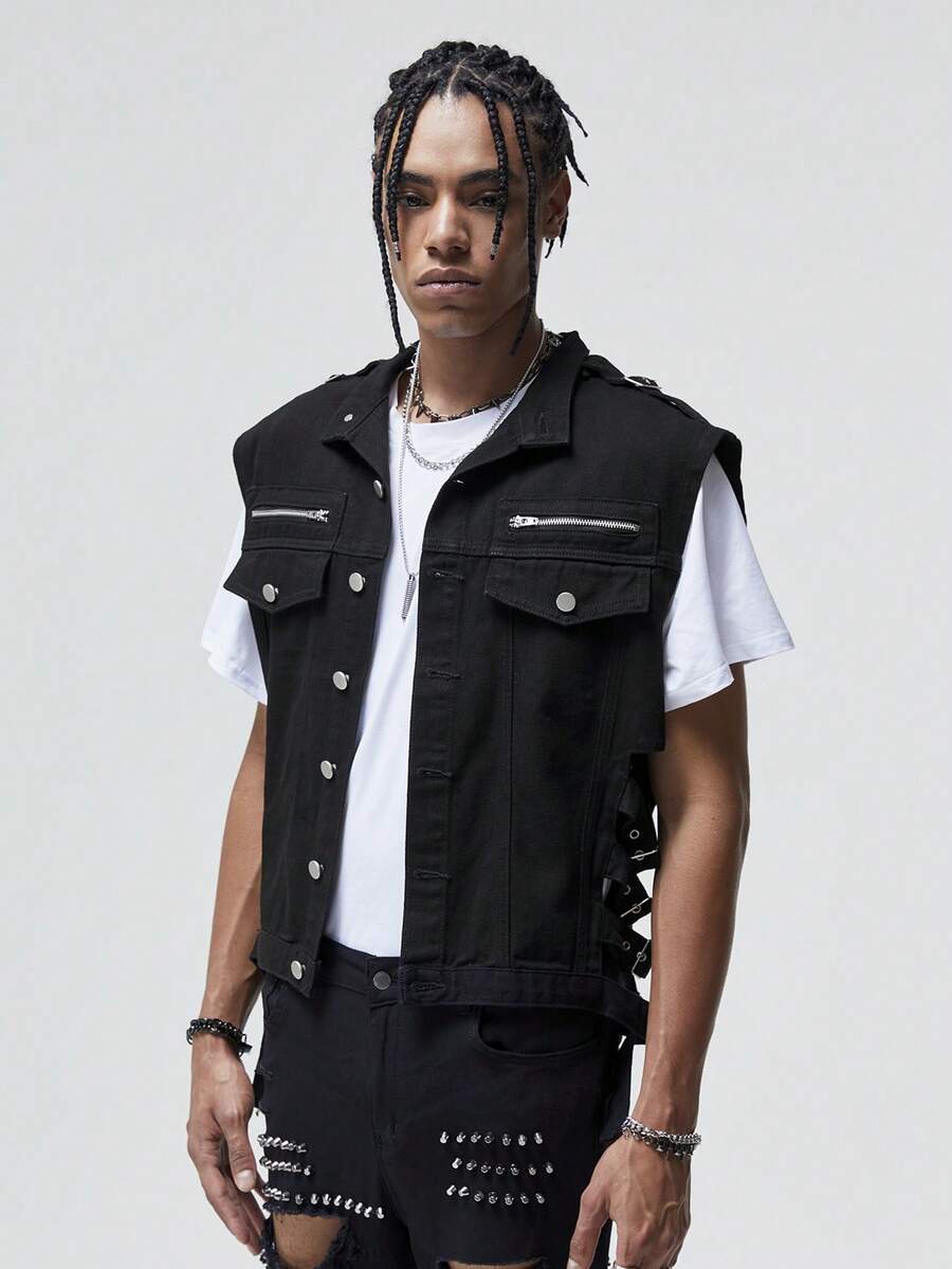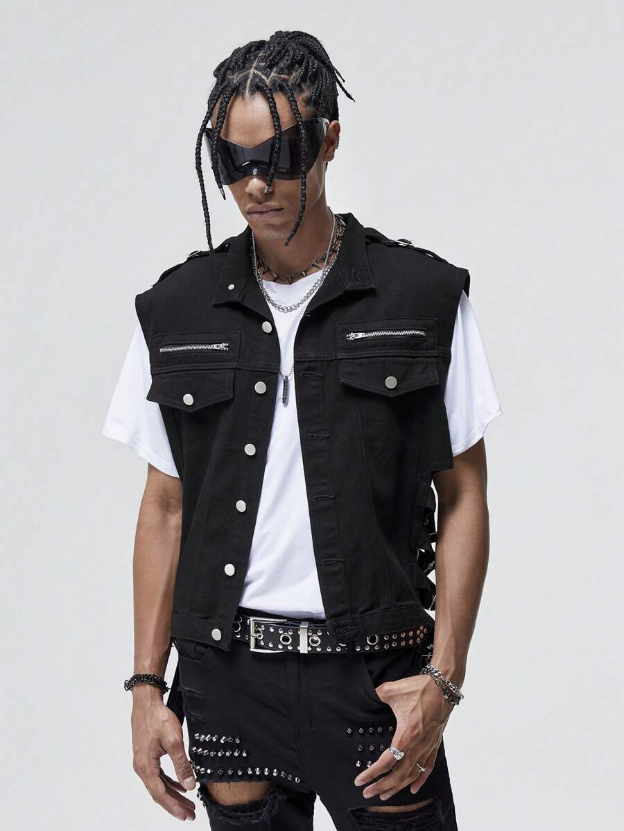 ROMWE Avant Guys Flap Pocket Denim Vest Jacket Without Tee