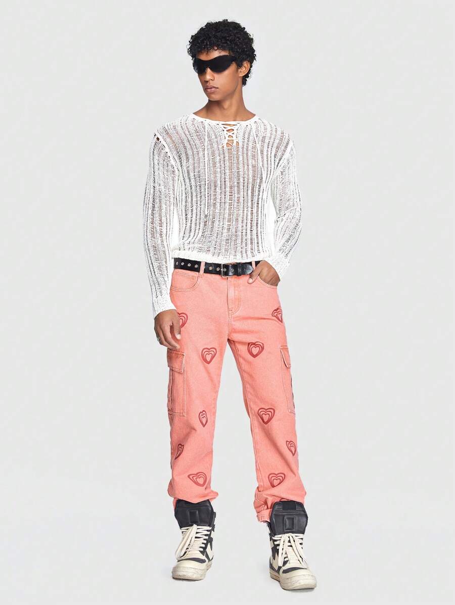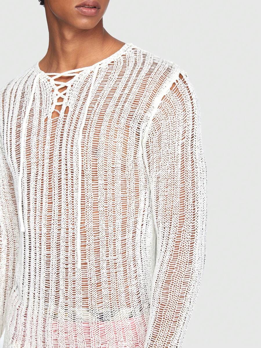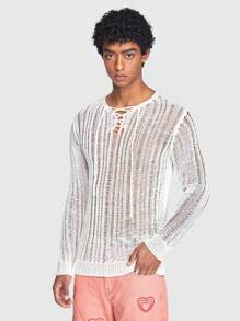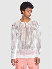 ROMWE Avant Guys Lace Up Front Pointelle Knit Sweater
