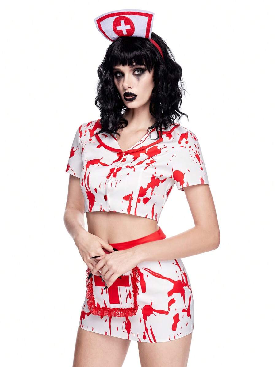 ROMWE Avant Halloween Nurse Cosplay Costume Set - Bloody Cross Print Sexy Blouse & Mini Skirt Roleplay Outfit For Women