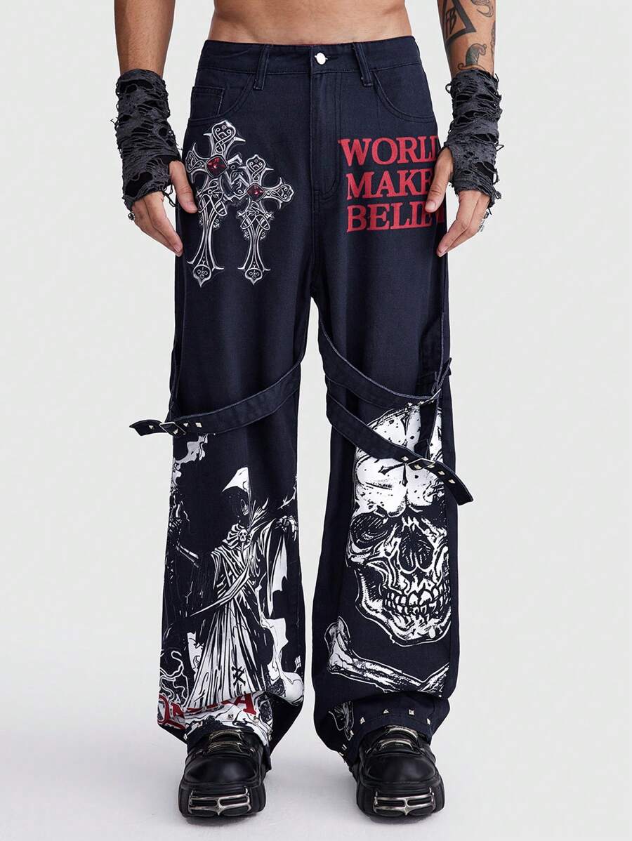 ROMWE Avant Men's Letter, Cross, Skull Print Casual Jeans With Pockets, School