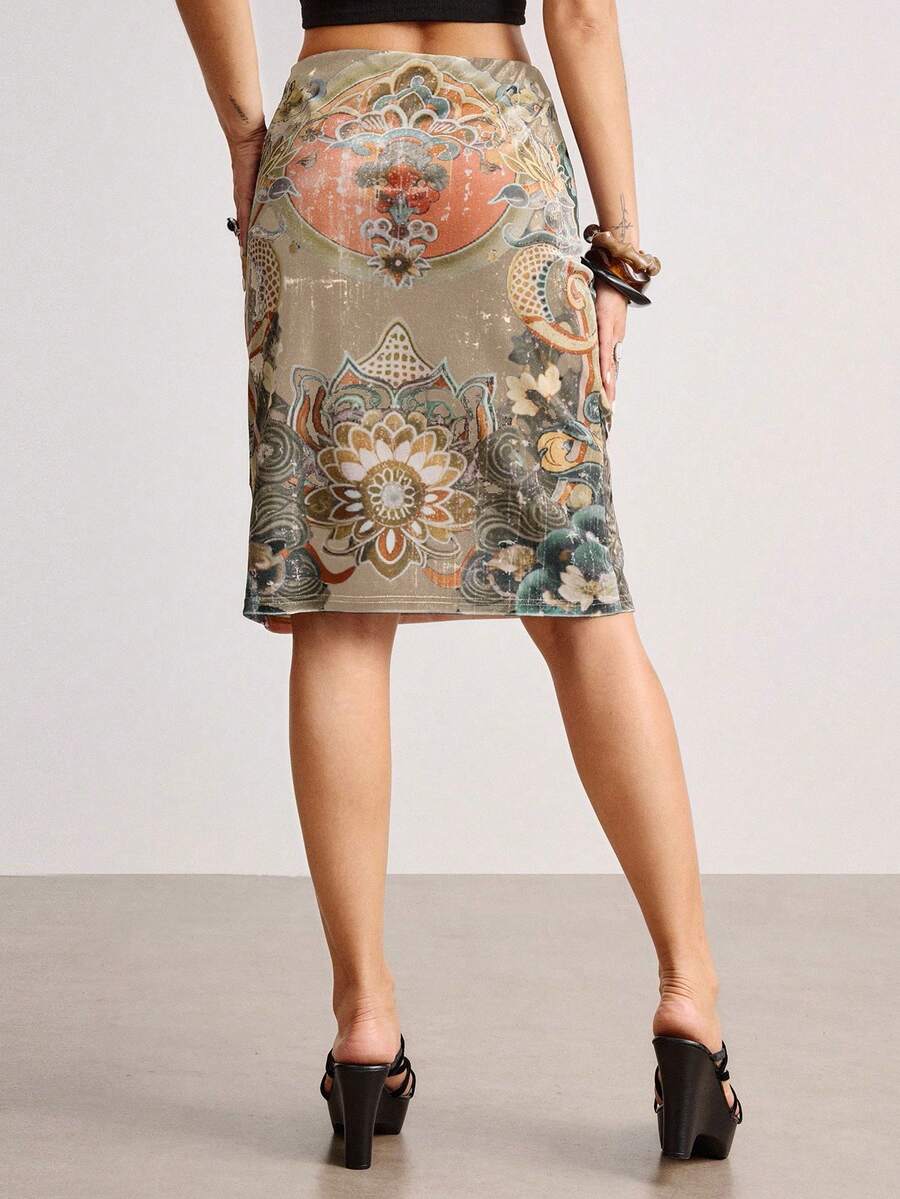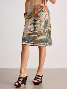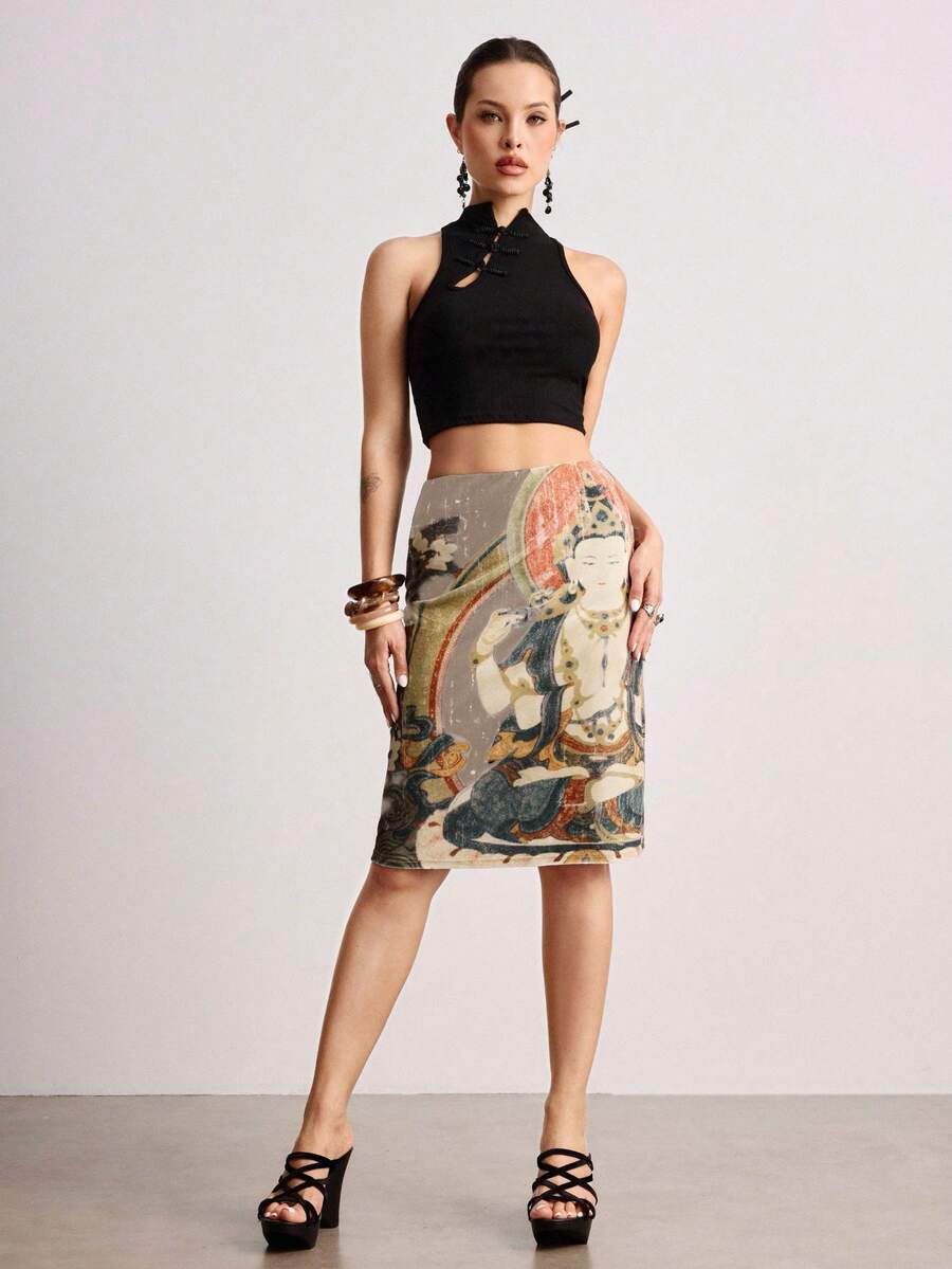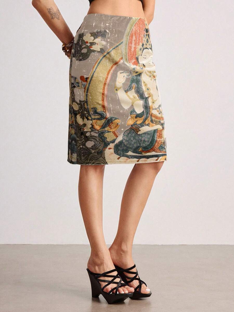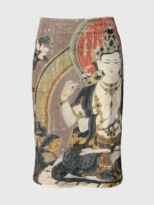 ROMWE Avant Oriental Aesthetic Buddha Painting Thangka Floral Women's Skirt