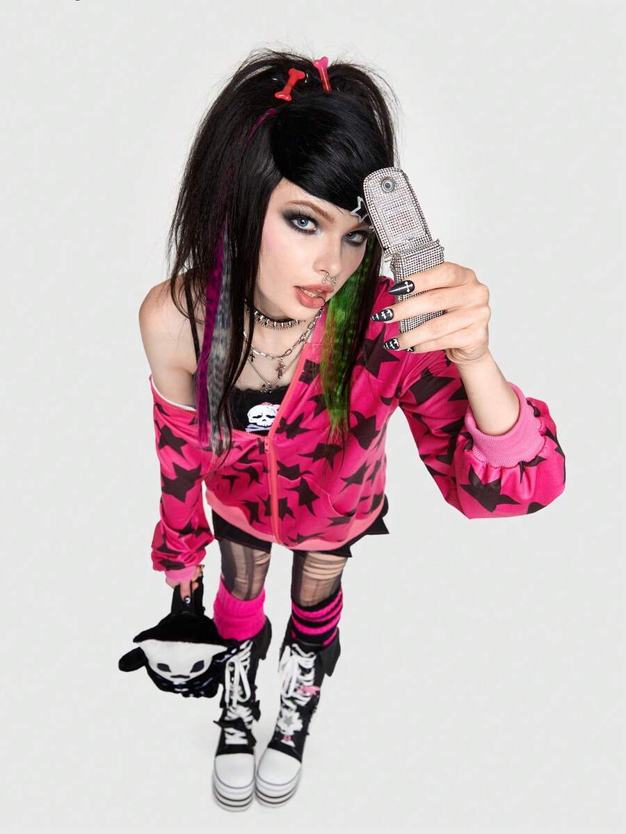 ROMWE Avant Scene Outfits Star Print Zip Up Hoodie Emo