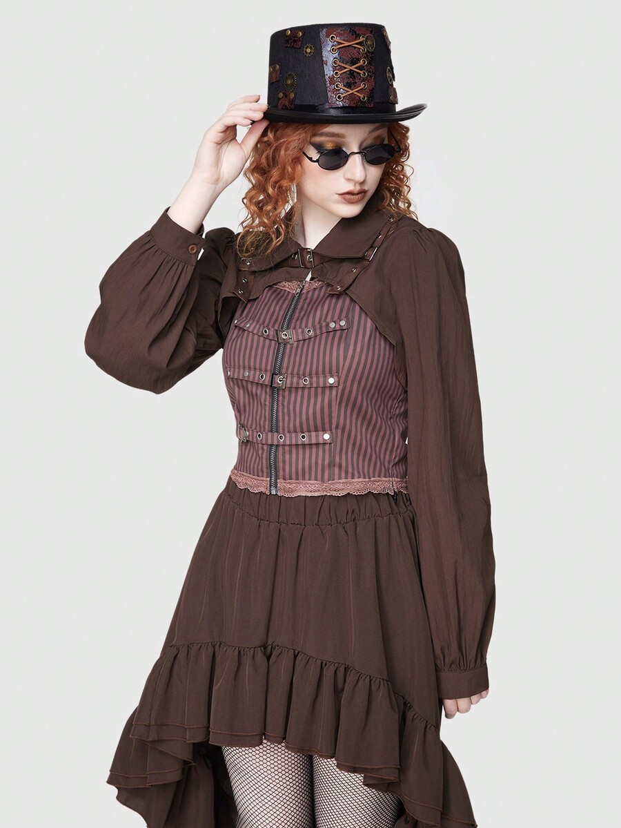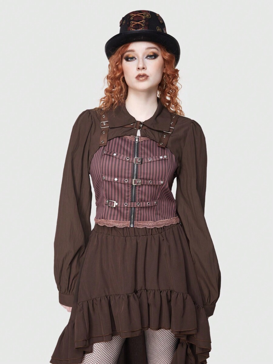 ROMWE Avant Women's Brown Turn Down Collar Long Sleeve Shirt