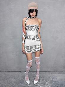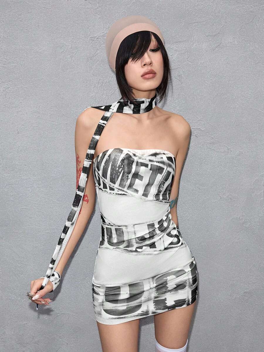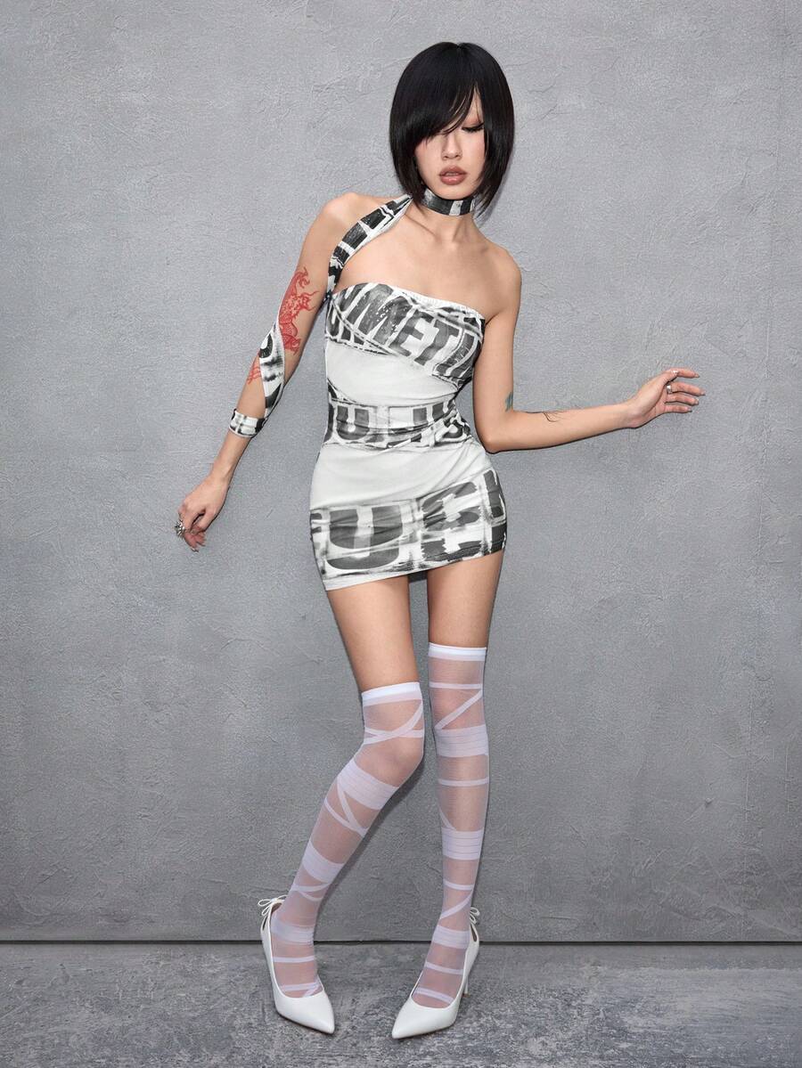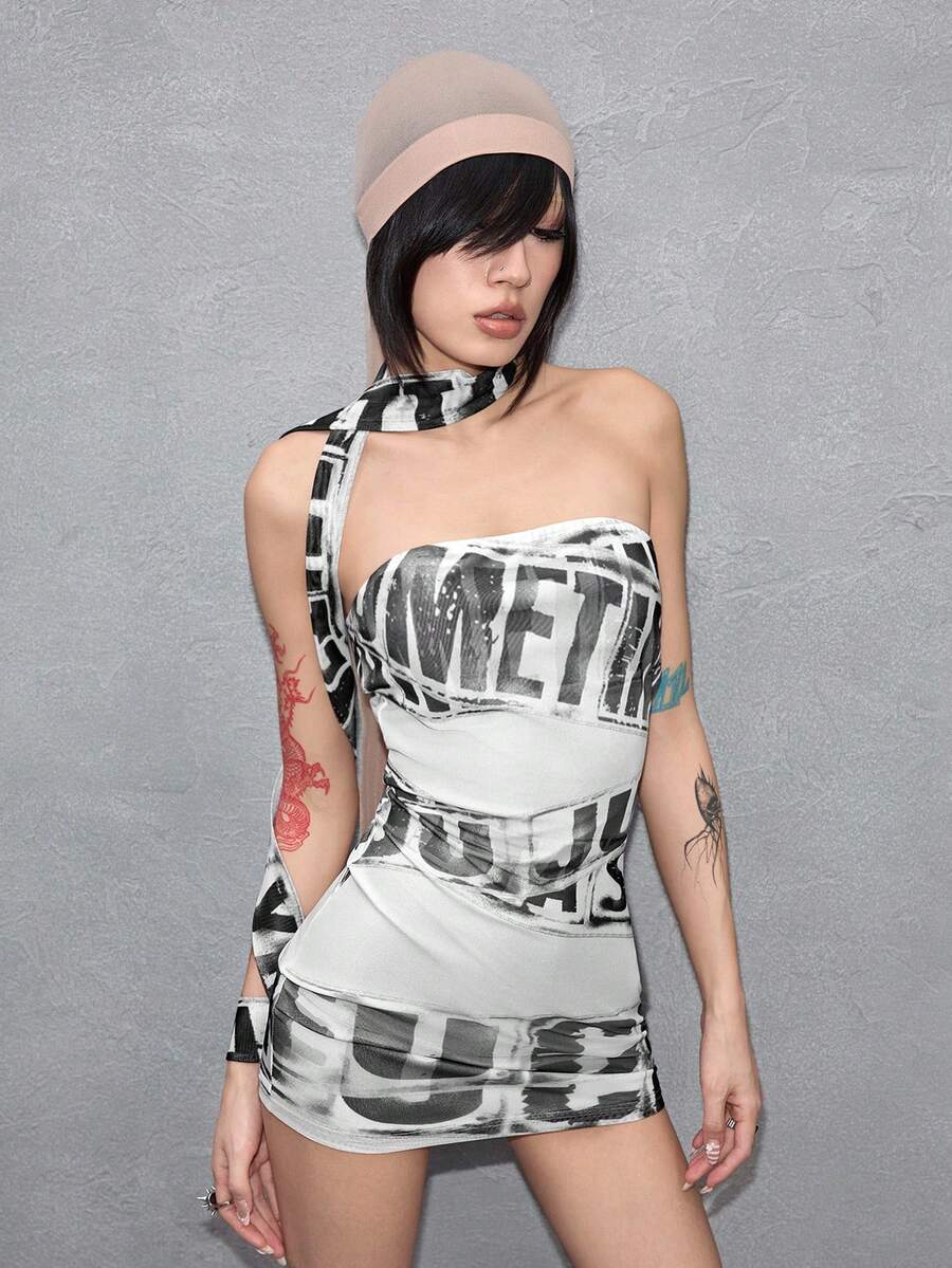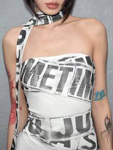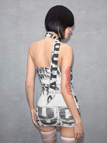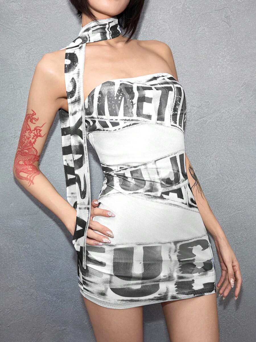 ROMWE Avant Women's Sexy Y3K Avant-Garde Logo Graphic Sheer Mini Bandeau Dress