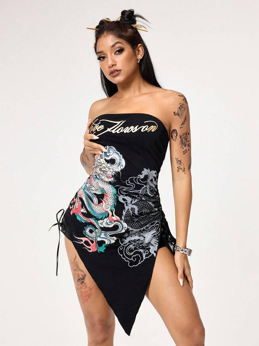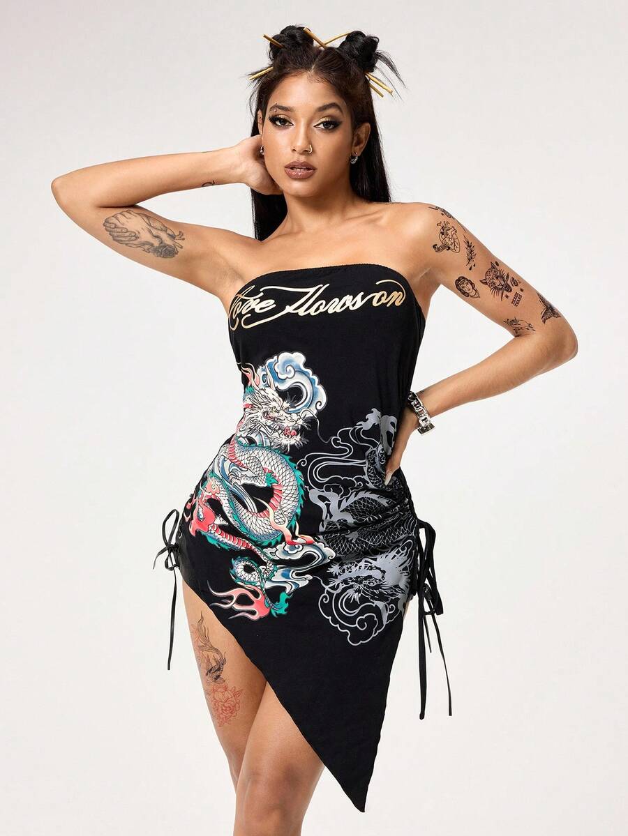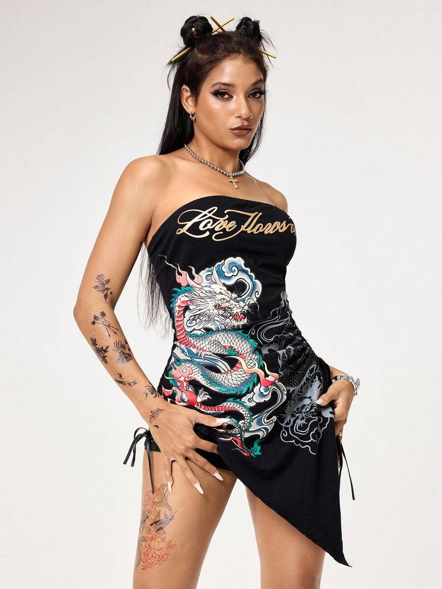 ROMWE Avant Y2K Style Dragonscale Print Ruched Asymmetric Hem Women Top