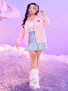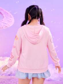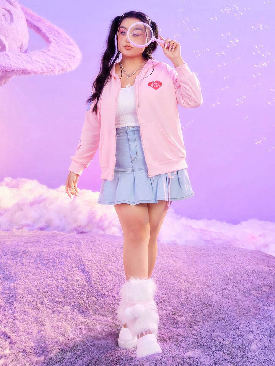 ROMWE X Care Bears Plus Cartoon Bear Printed Zip Up Drawstring Hoodie