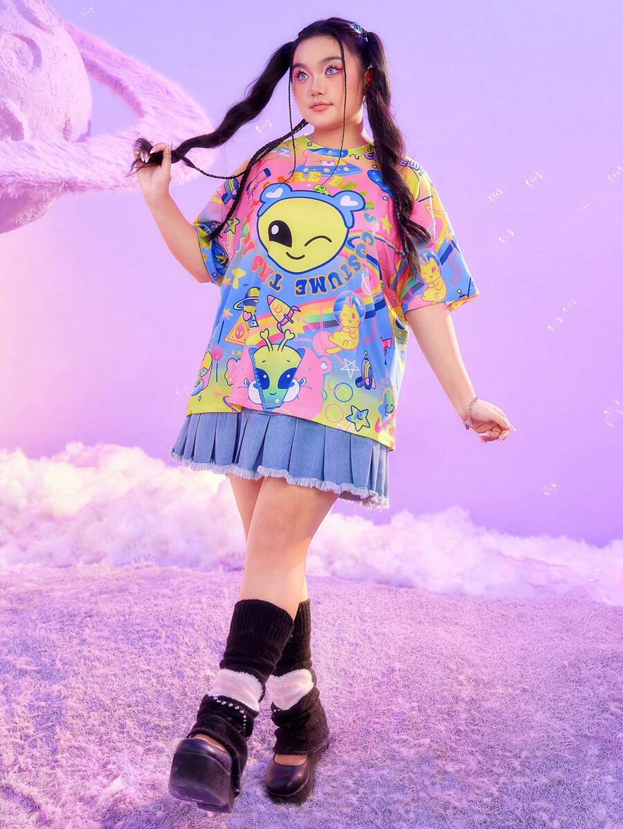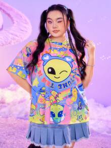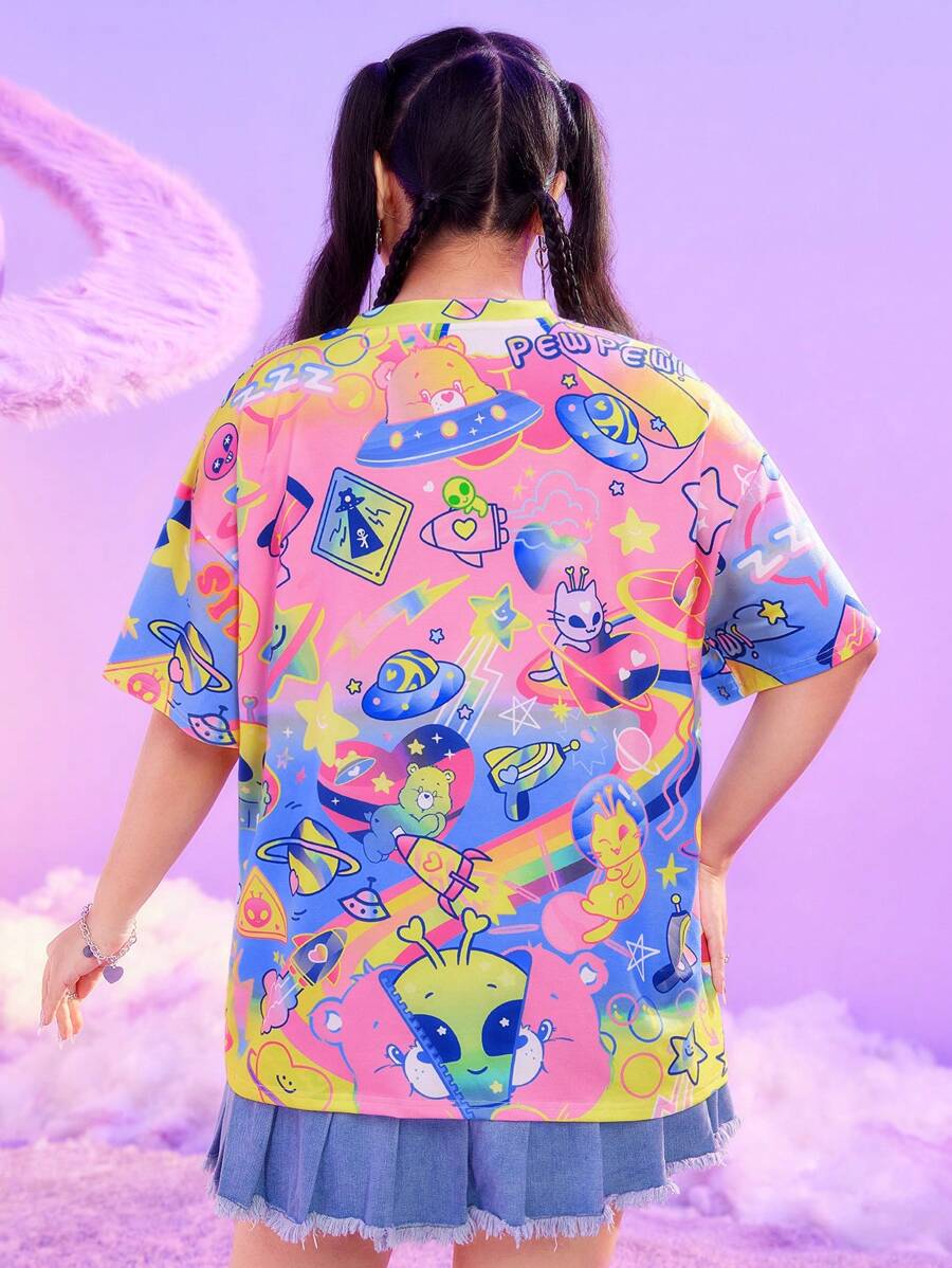 ROMWE X Care Bears Plus Cartoon And Slogan Print Drop Shoulder T-Shirt