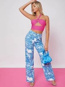 Ruched O-Ring Cutout Self-Tie Halter Crop Top