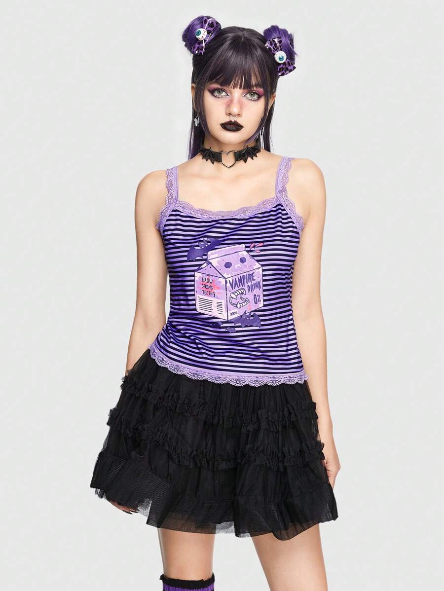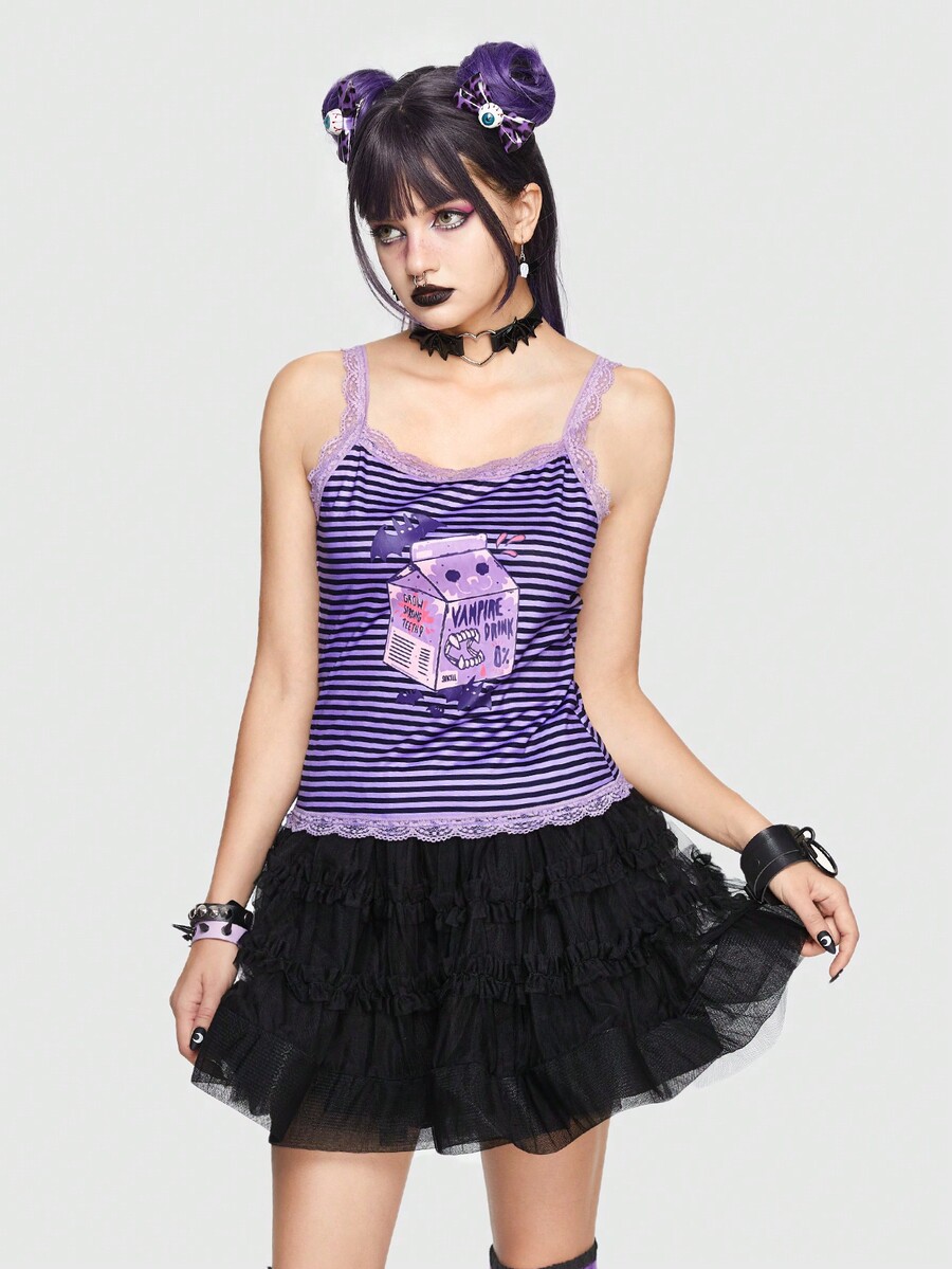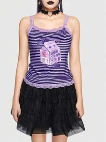SICKYLL Striped Cartoon Graphic Contrast Lace Cami Top