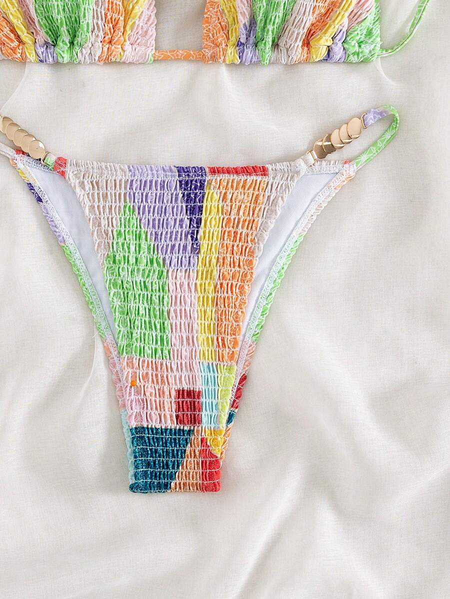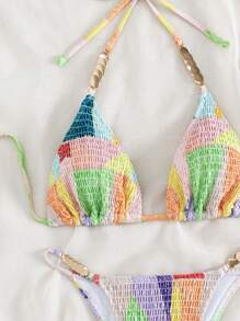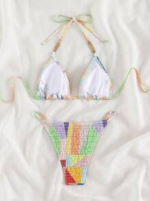 Smocked Halter Triangle Bikini Set, For Summer Beach Vacation