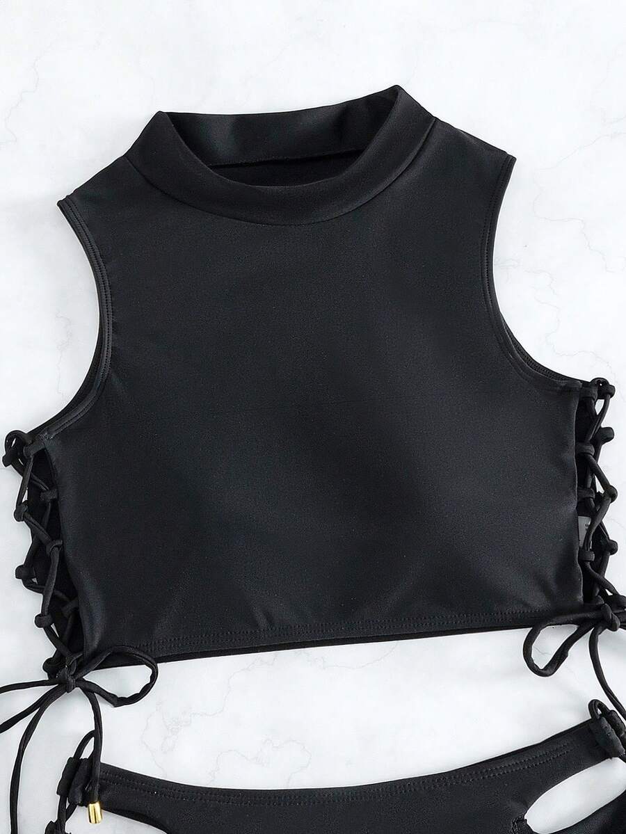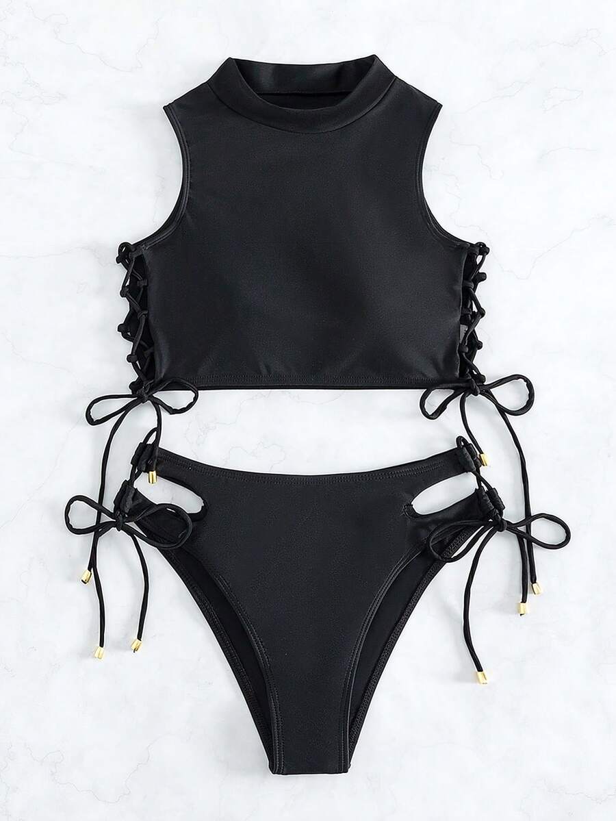 Solid Bikini Set Lace Up Side High Neck Tank Top & Tie Side Bottom 2 Pieces Bikini Summer Beach