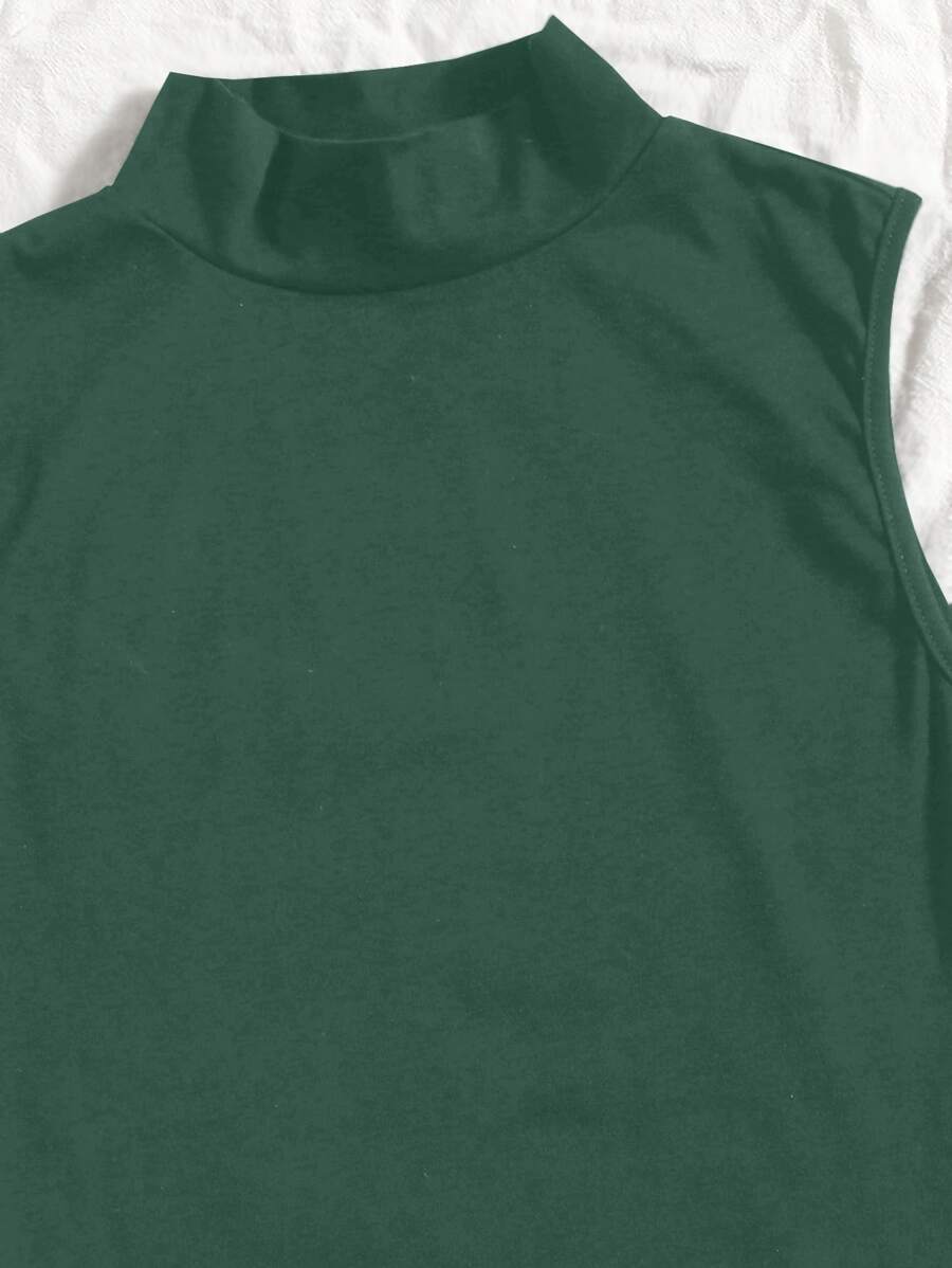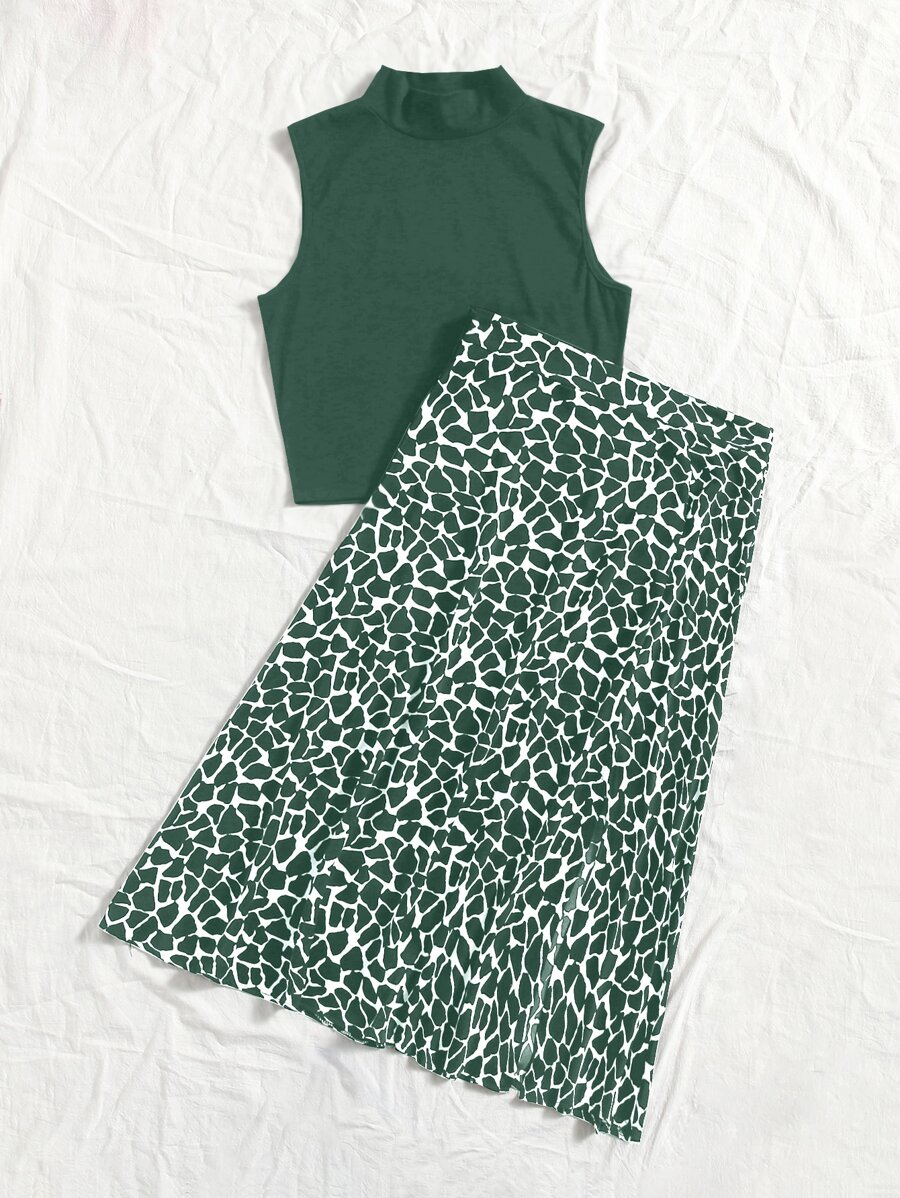 Solid Mock Neck Tank Top & Allover Print Skirt