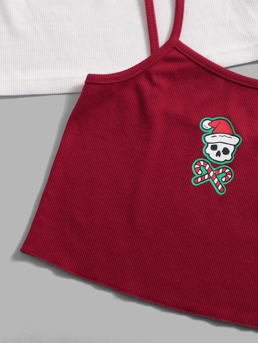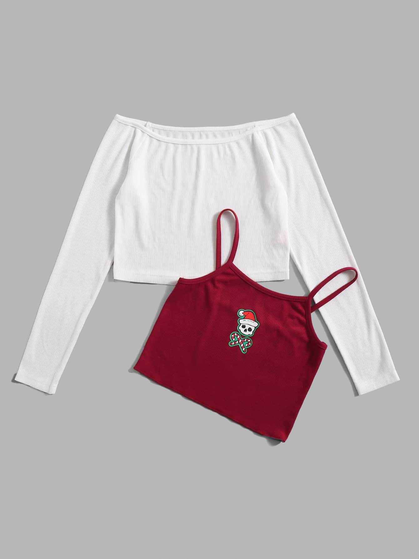 Solid Off The Shoulder Ribbed Tee & Christmas Skull Graphic Crop Cami