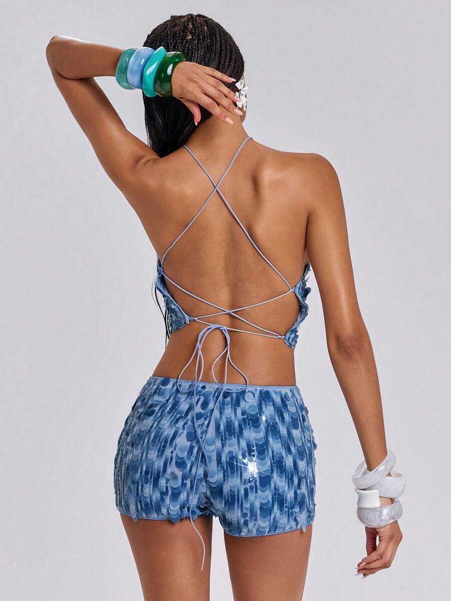 Spring/Summer Vacation Style Blue Beaded Halter Neck Sleeveless Top For Women