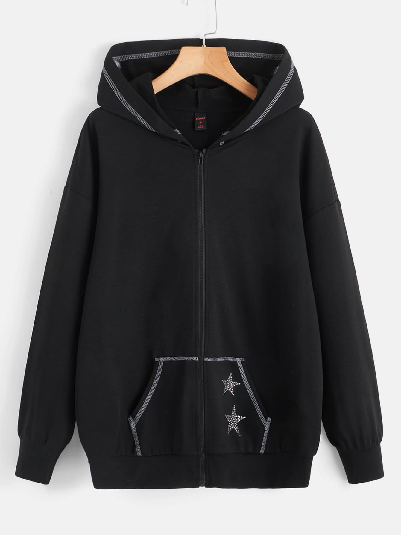 Star Rhinestone Kangaroo Pocket Zip Up Hoodie