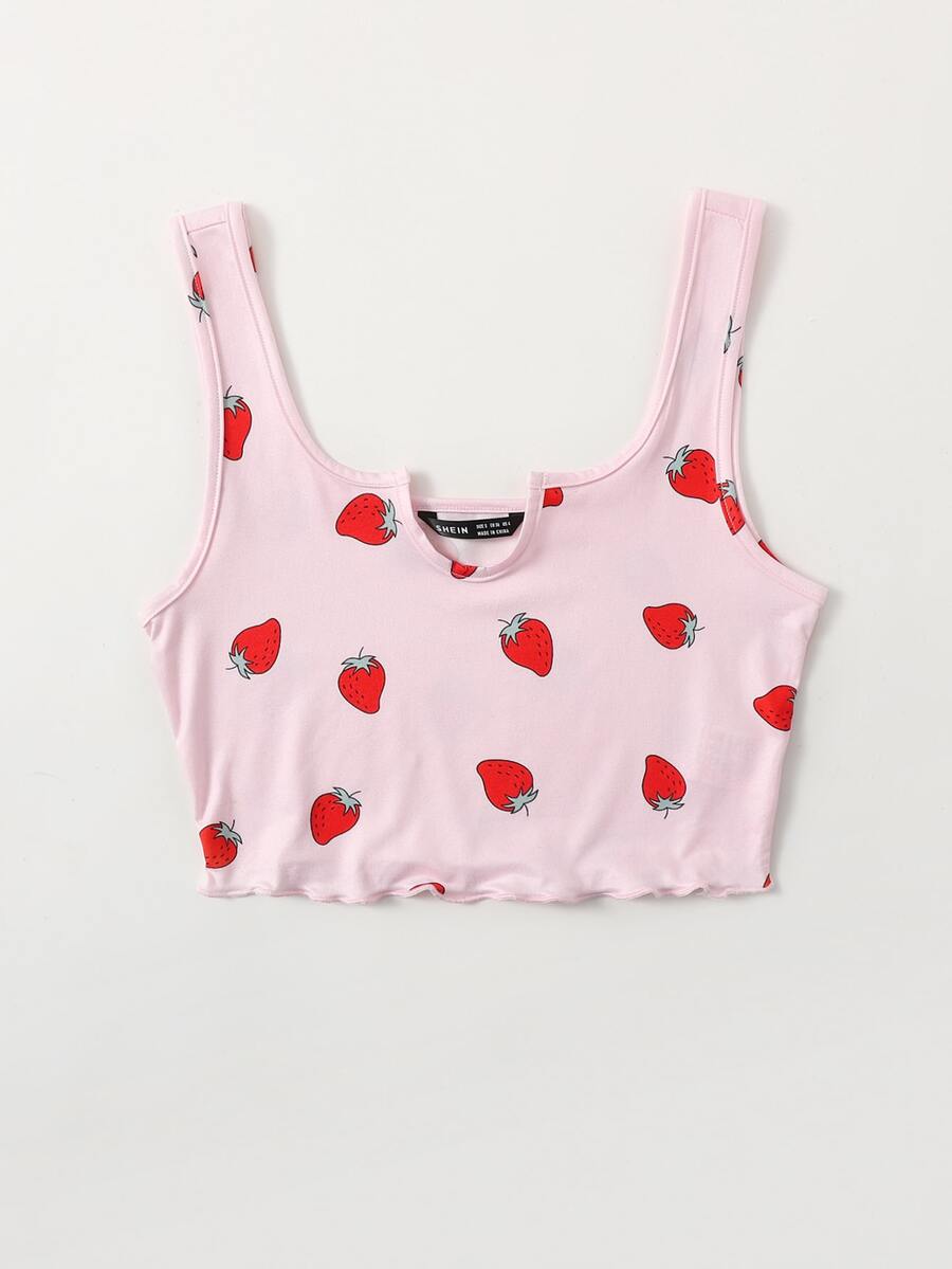 Strawberry Print Notch Neck Lettuce Edge Tank Top