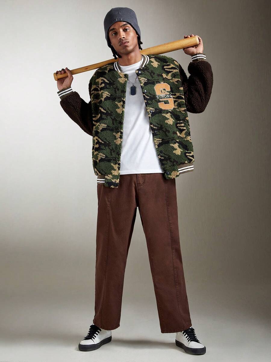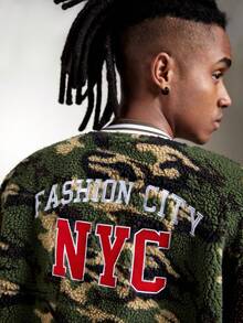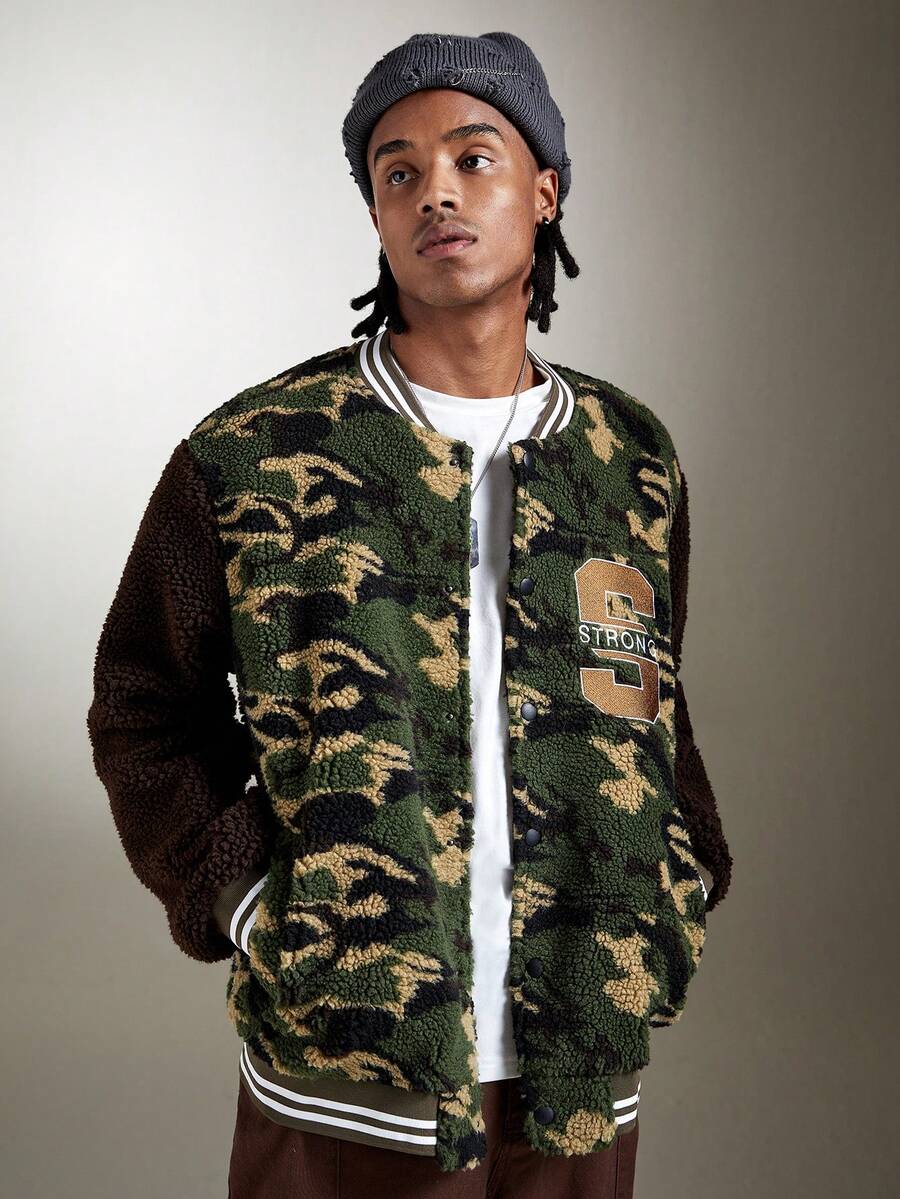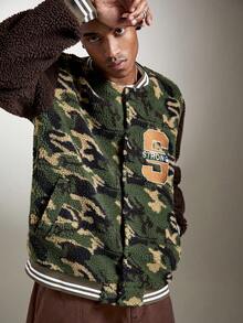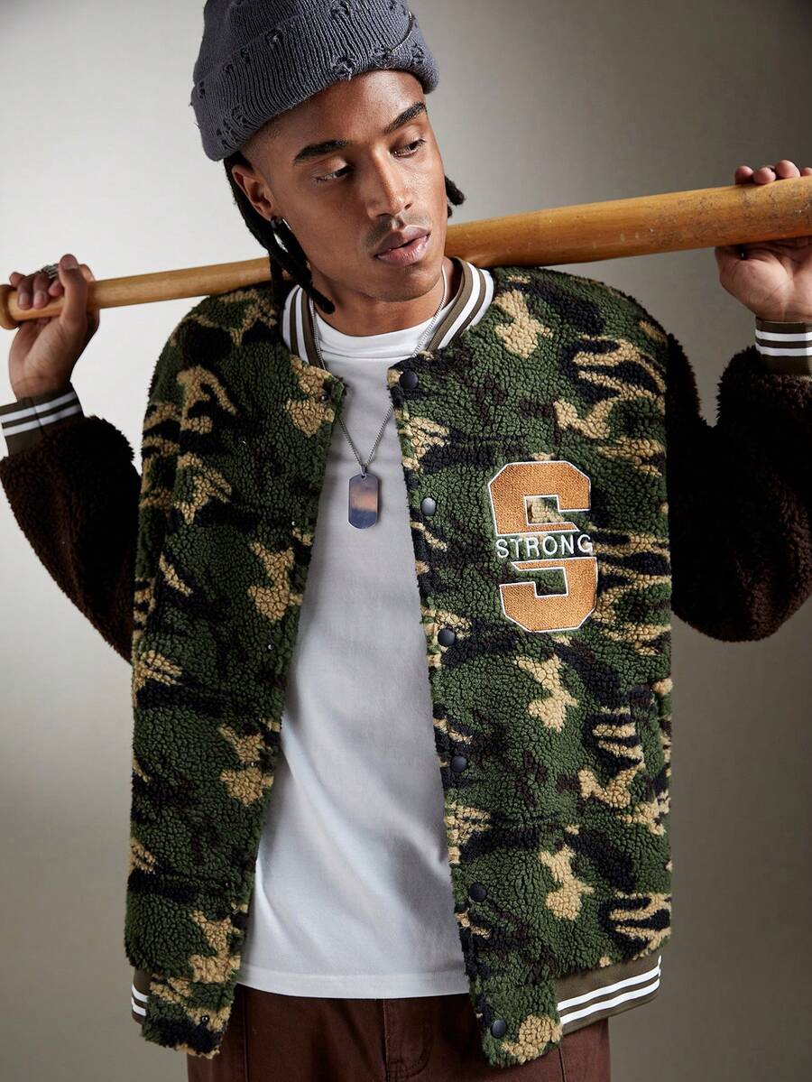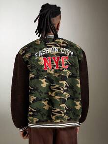 Street Life Guys Camo & Letter Graphic Striped Trim Bomber Jacket