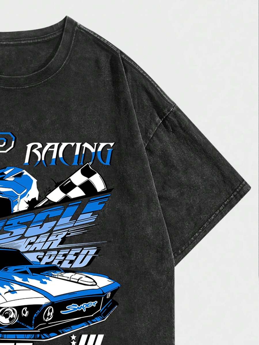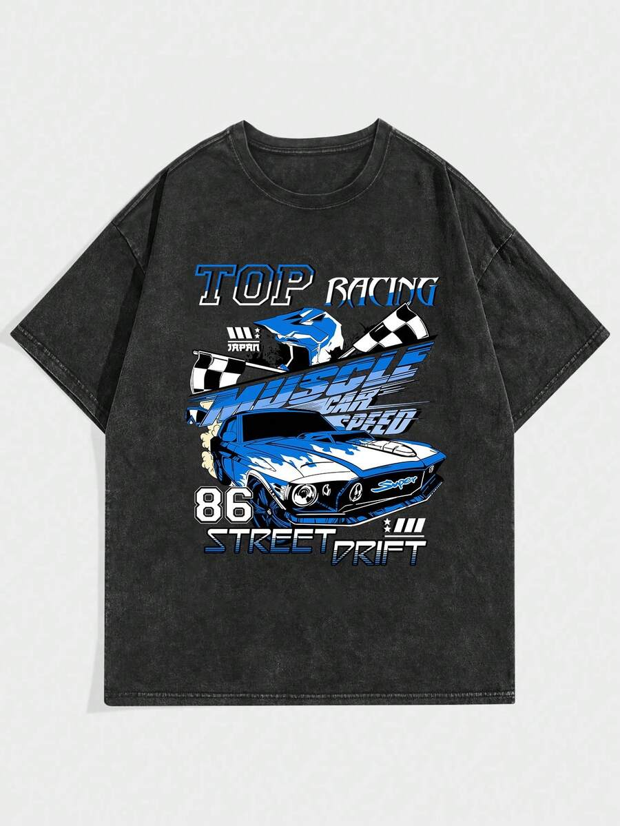 Street Life Men Car & Letter Graphic Drop Shoulder Tee