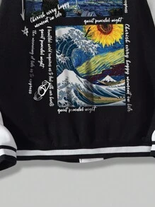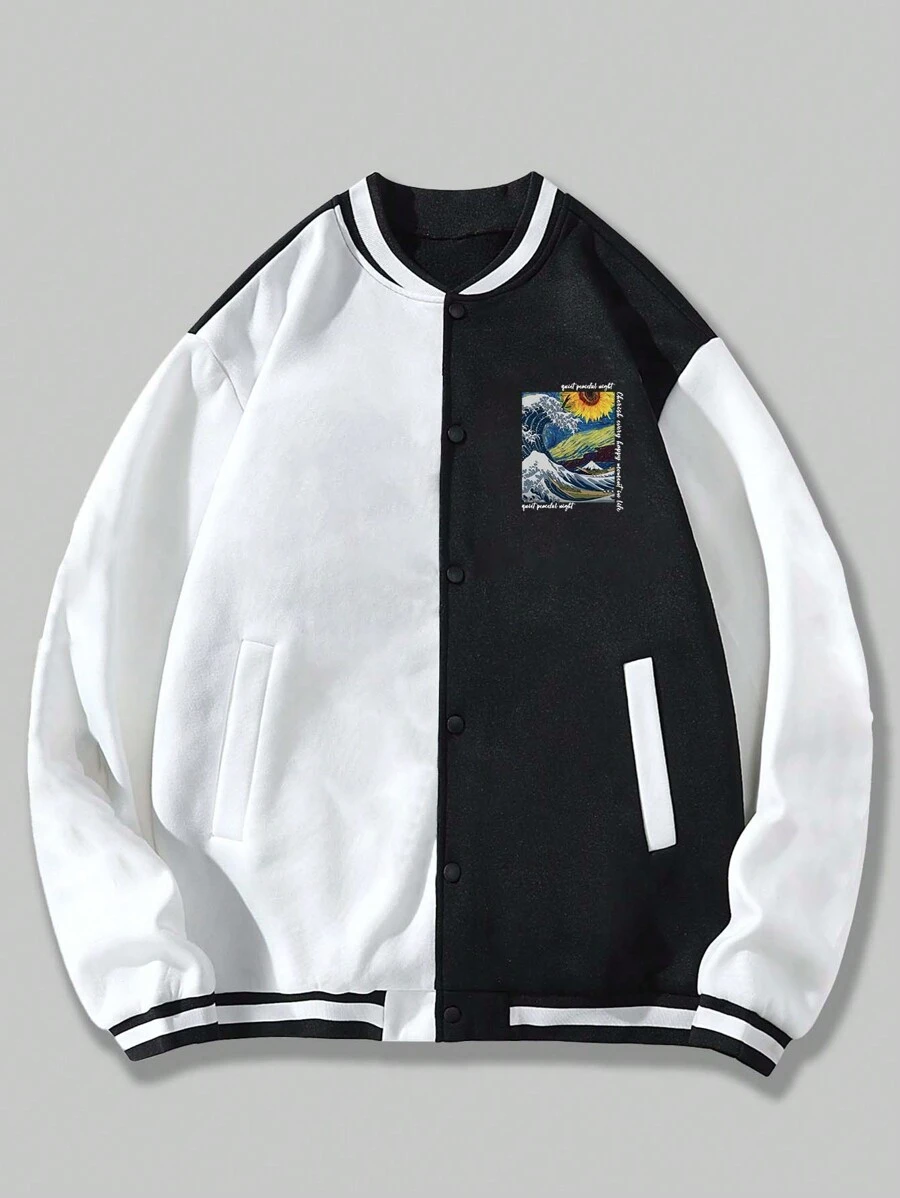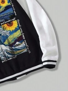 Street Life Guys Slogan & Sunflower Print Striped Trim Colorblock Varsity Jacket