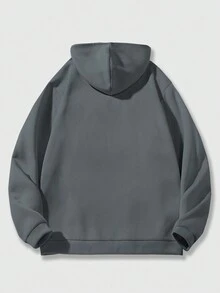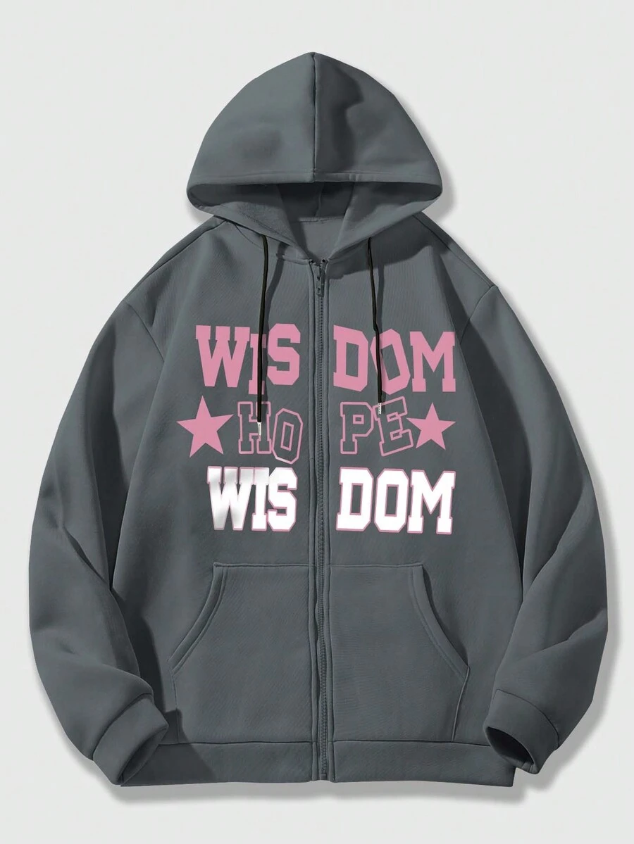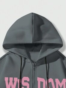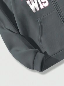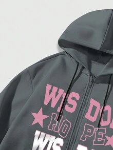 Street Life Men Letter Print Zipper Front Drawstring Hoodie
