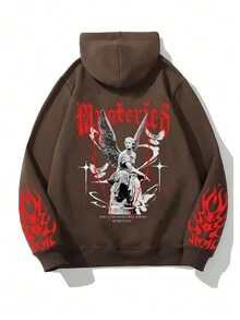 Street Life Men Letter & Sculpture Print Kangaroo Pocket Drawstring Thermal Hoodie