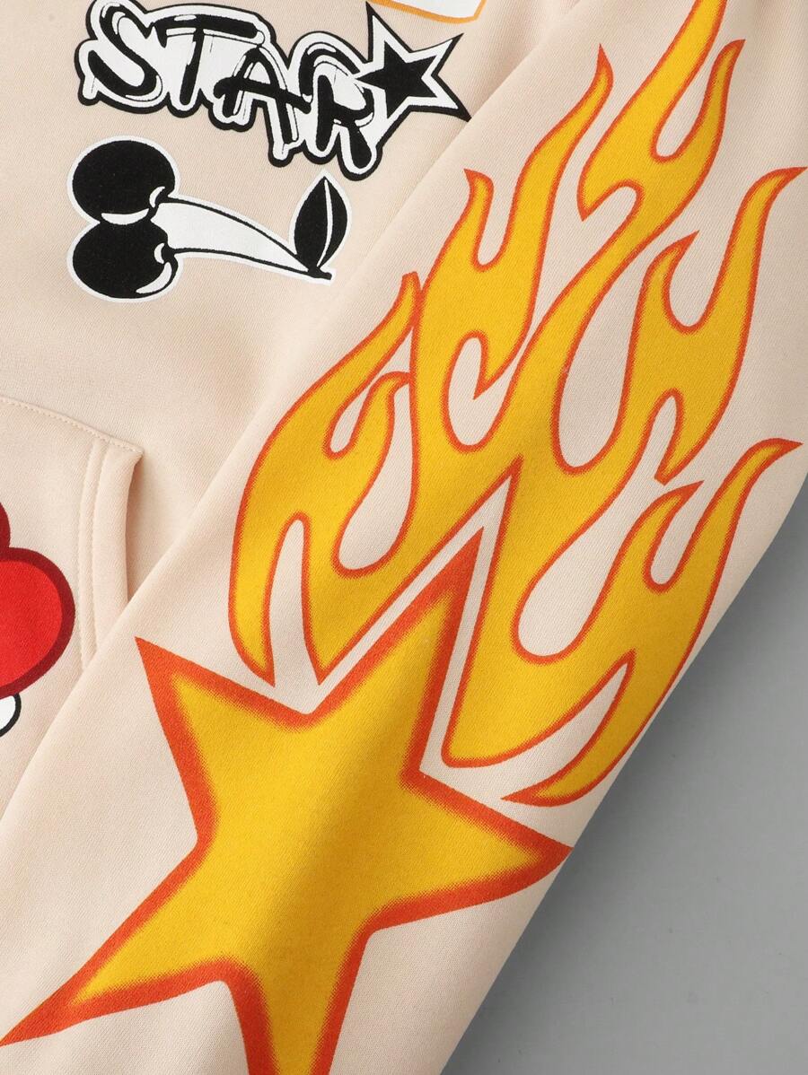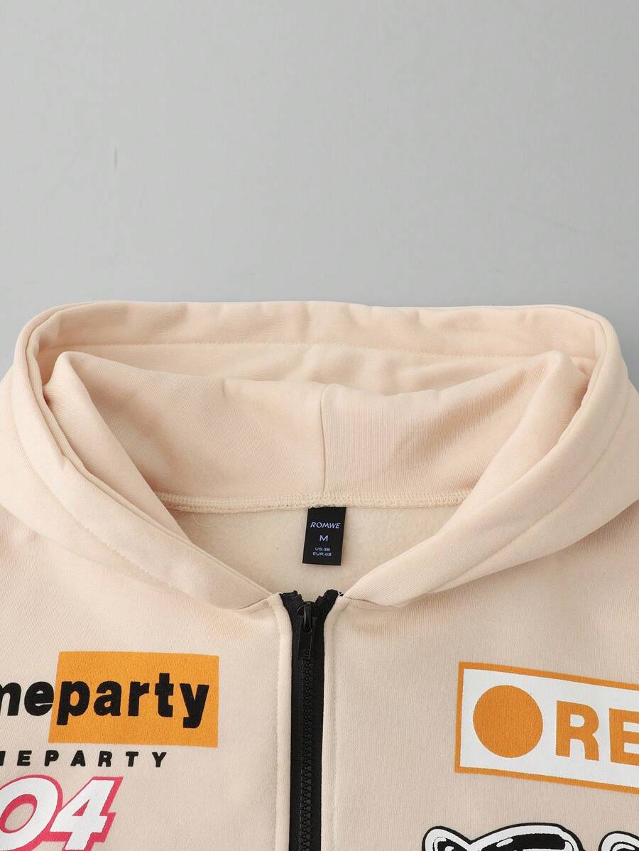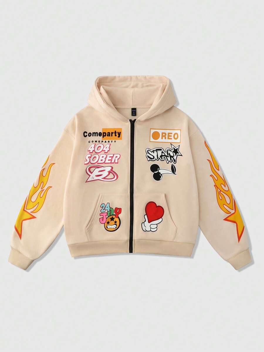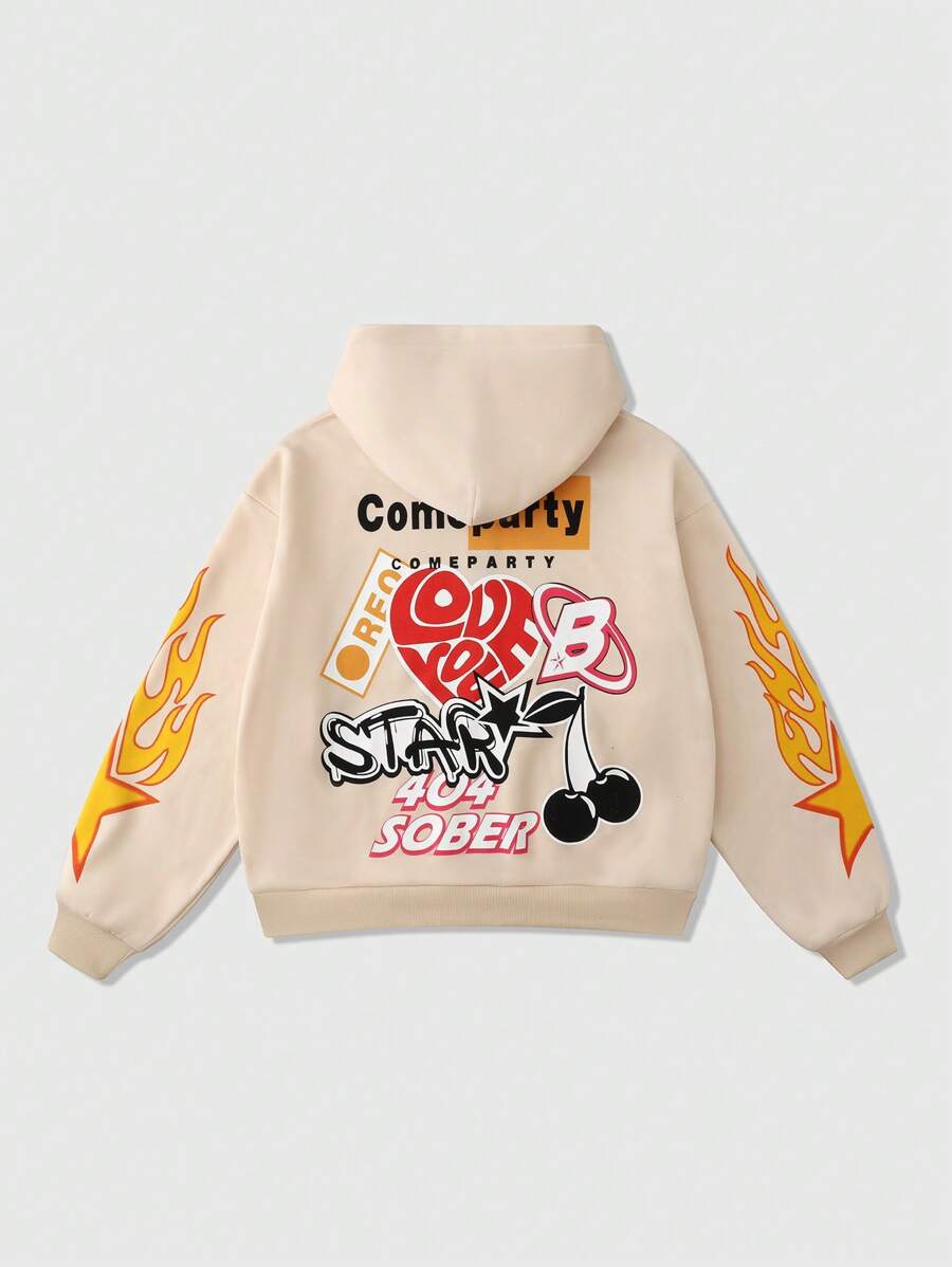 Street Life Men's Autumn/Winter Letter & Flame Print Zip Front Hooded Casual Sweatshirt